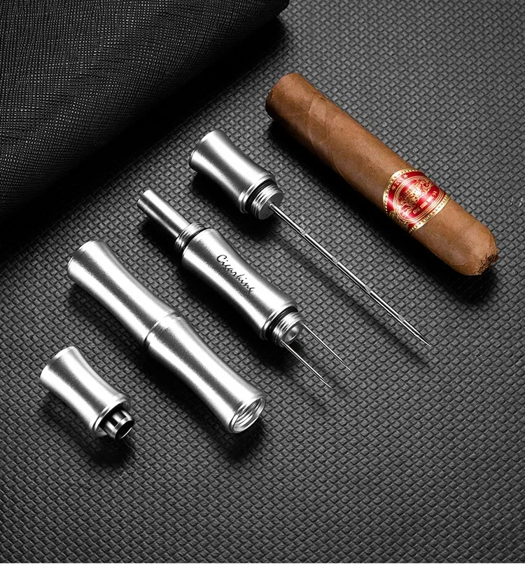 Experience the perfect cigar session with this versatile portable cigar accessory, expertly crafted from durable metal in stylish silver and black finishes. Its elongated, pen-like design offers a modern, minimalist aesthetic, while the faint horizontal grooves near the center enhance grip and add subtle detail. Compact and lightweight, this 4-in-1 tool seamlessly combines a cigar punch cutter, puncturing needle, cutting blade, and protective cap into a single, easy-to-carry device. Designed for avid cigar lovers who appreciate both form and function, it ensures precise preparation and effortless handling. Whether you're at home or on the move, this accessory elevates your cigar experience with its sleek look and reliable performance, making it a must-have for dedicated connoisseurs seeking convenience and style.