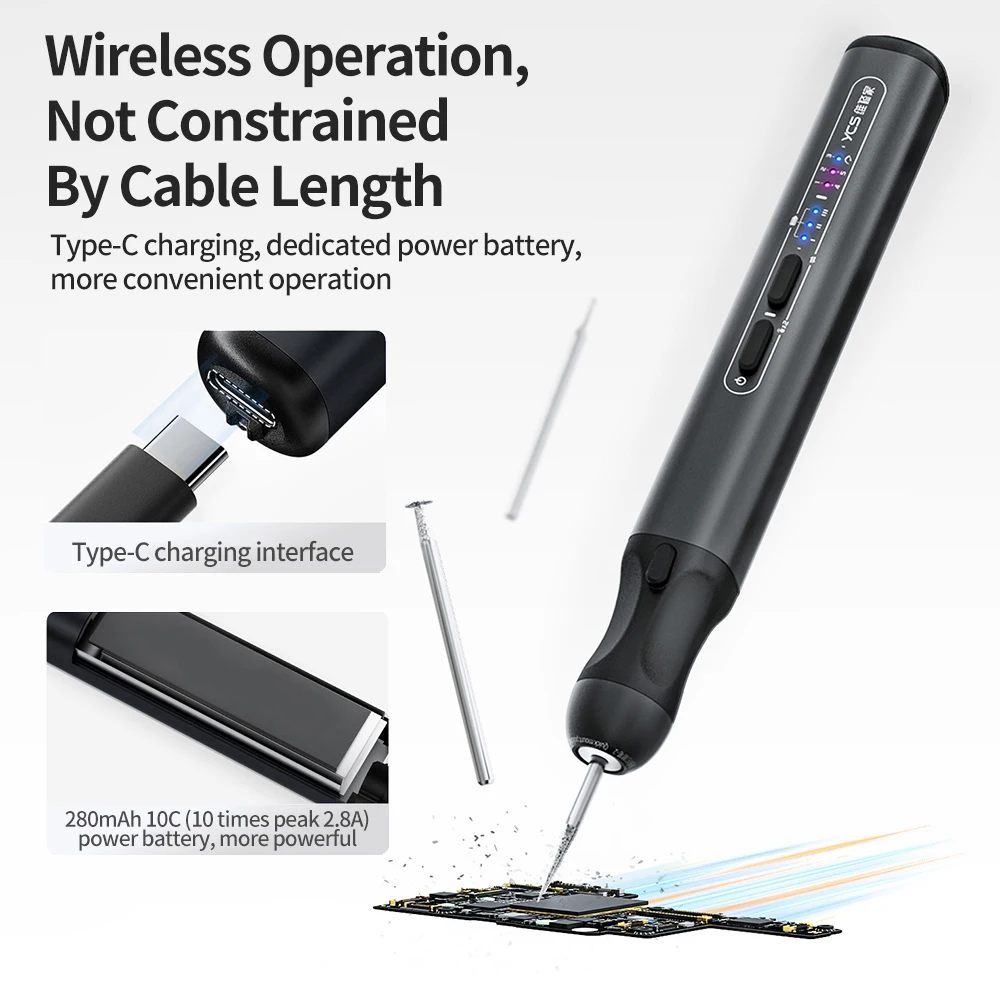 Experience precision and ease with this sleek, black portable polishing pen designed by YCS. Its compact size of just 128.14 x 16.6 x 17.7 mm and lightweight build of 72.4g make it ideal for detailed electronic repairs, engraving, and DIY projects. The textured grip ensures comfortable handling during delicate work, while the modern design combines minimalist elegance with professional aesthetics. Equipped with adjustable speeds from 5,900 to 16,200 RPM and a memory function, this tool adapts seamlessly to your needs. The wireless operation and Type-C charging add convenience and efficiency. Whether polishing PCB components or engraving with fine tips, this device provides precise control and smooth operation, empowering you to achieve clean, professional results every time. Its advanced features guarantee durability and performance for long-lasting use.