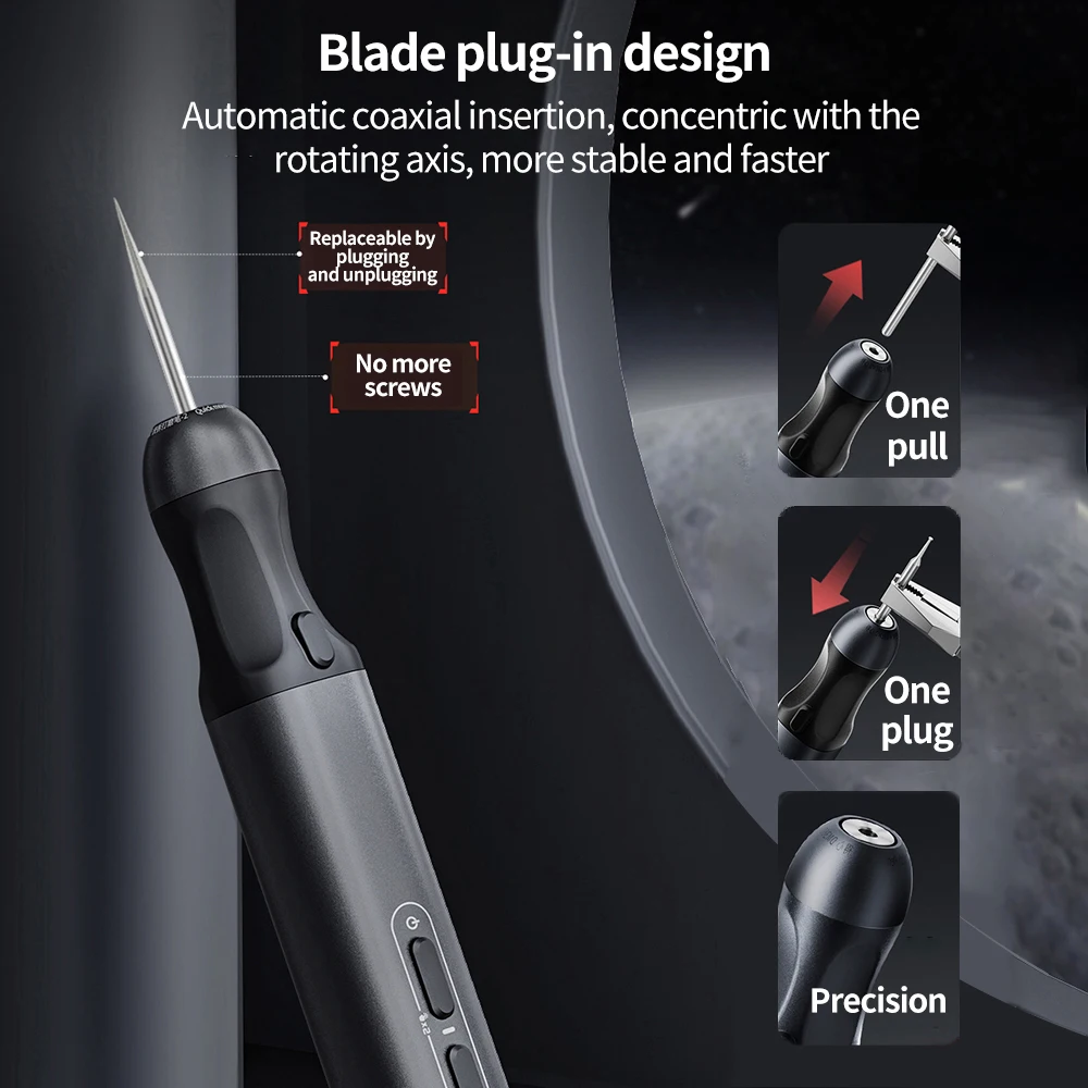 - Quick tool change with auto-alignment system ensures tips are stable and centered, facilitating efficient and accurate work on PCBs, chips, or engraving materials.