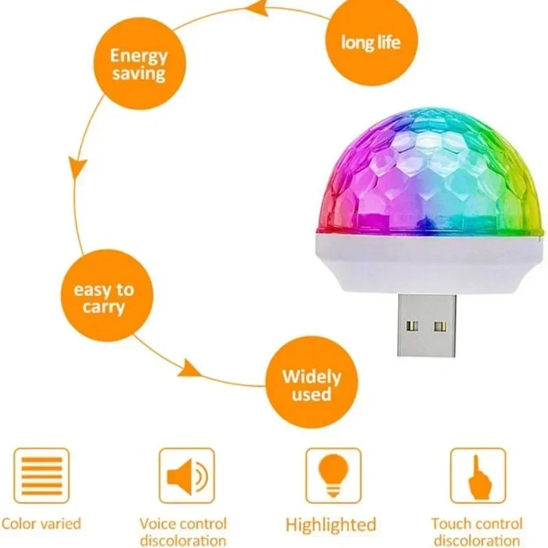 Create a vibrant, dynamic atmosphere with this portable USB-powered mini disco ball light, featuring a faceted, hemisphere design that sparkles and refracts colorful light patterns. Illuminated in white or translucent tones with a sleek, minimalist aesthetic, it projects swirling hues of purple, pink, blue, and red, transforming any space into a lively party environment. Equipped with a smart voice activation sensor, it reacts to music or sounds by changing colors and speeds, making it ideal for mobile celebrations, weddings, birthday parties, Christmas, or karaoke nights. Lightweight and energy-efficient, this mini disco light is easy to carry and perfect for spontaneity and fun in any setting.
