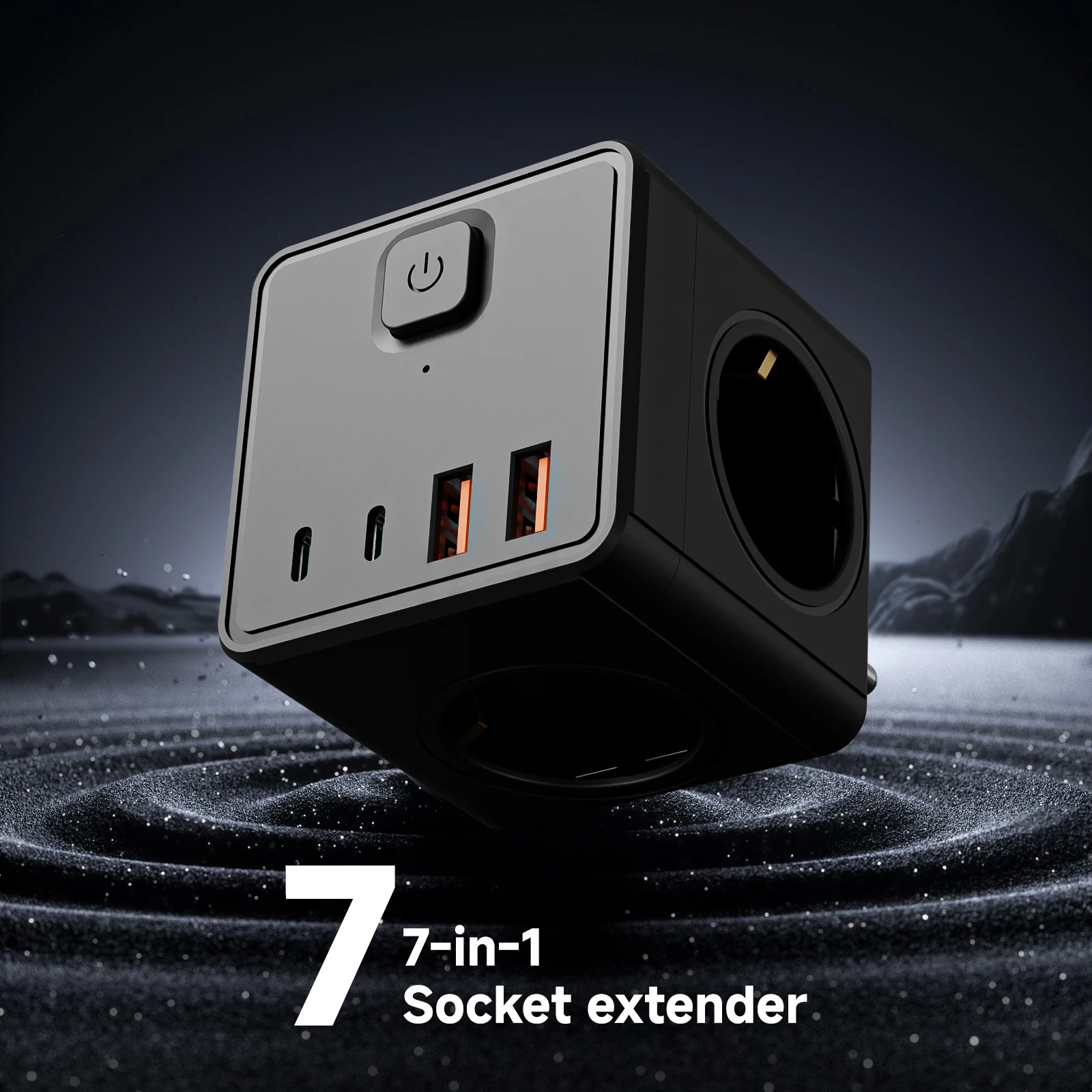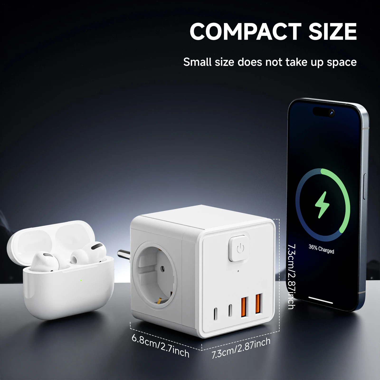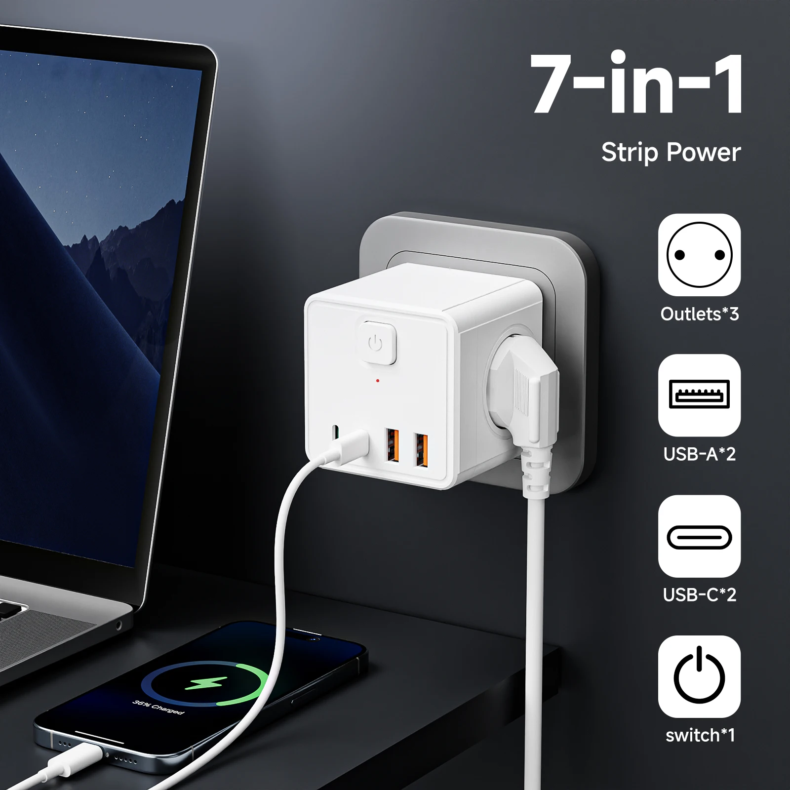 Experience seamless power management with this compact 7-in-1 square power strip featuring 3 AC sockets, 2 USB ports (max 2.1A, 5V each), and 2 Type-C ports, all powered by a universal EU plug suitable for 110V to 250V AC. Rated at 2500W and 10A, it includes a main switch for easy control, making it perfect for home, office, or travel. Designed with a sleek, minimalist white or black matte finish, rounded edges, and safety features like standard grounding and chemical-free materials, this versatile device ensures reliable, stylish, and portable power wherever your day takes you.