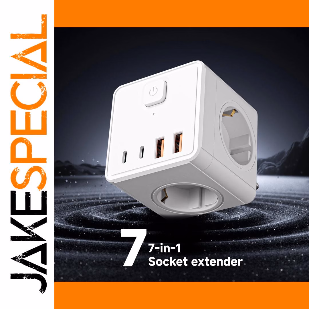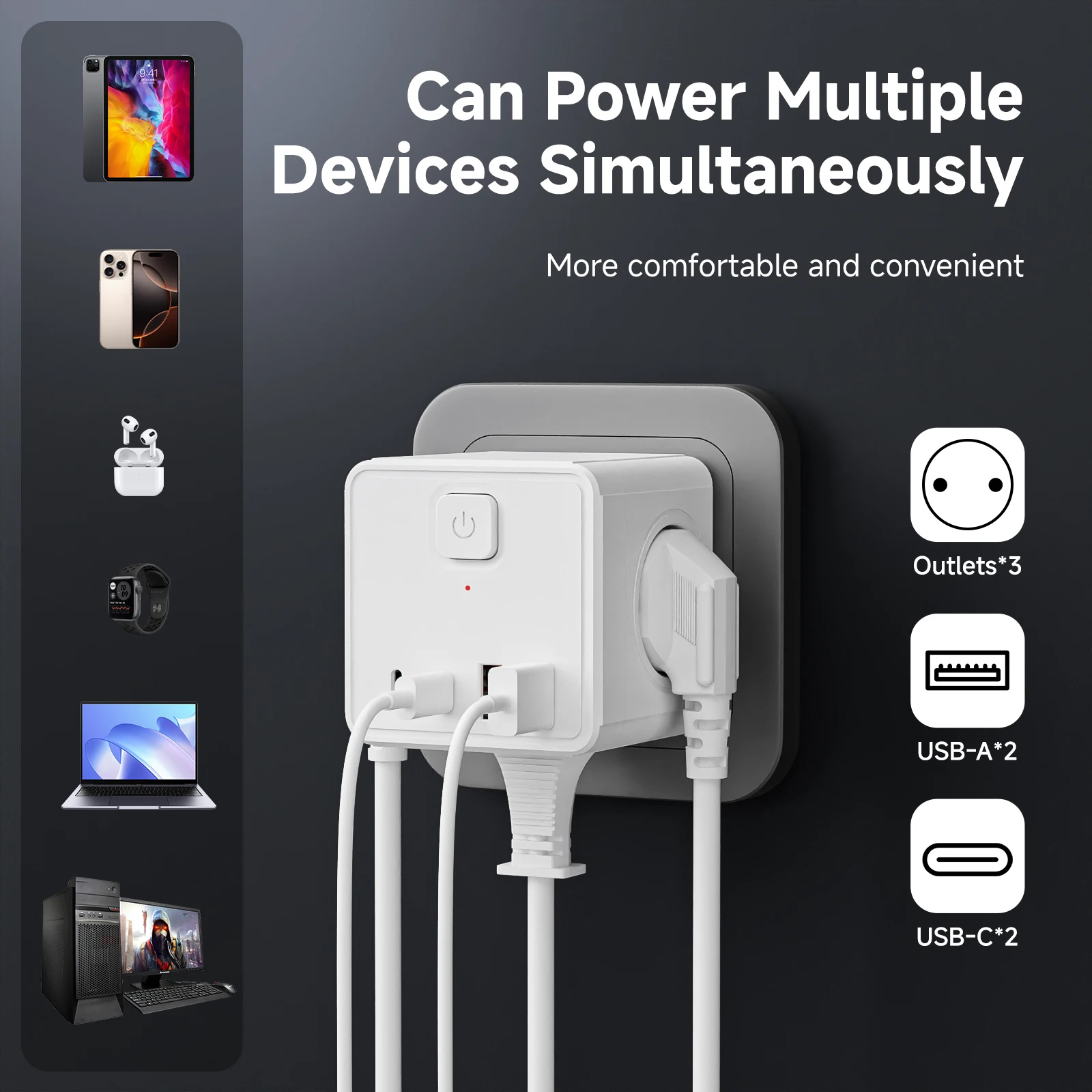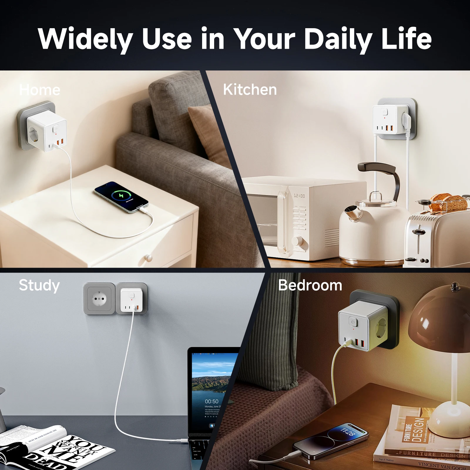 Experience seamless power management with this compact 7-in-1 square power strip featuring 3 AC sockets, 2 USB ports (max 2.1A, 5V each), and 2 Type-C ports, all powered by a universal EU plug suitable for 110V to 250V AC. Rated at 2500W and 10A, it includes a main switch for easy control, making it perfect for home, office, or travel. Designed with a sleek, minimalist white or black matte finish, rounded edges, and safety features like standard grounding and chemical-free materials, this versatile device ensures reliable, stylish, and portable power wherever your day takes you.