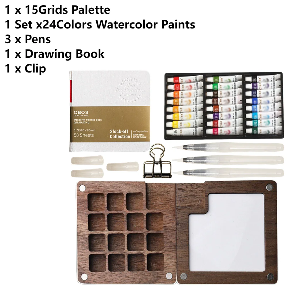 - Model-numbered as a pocket artist watercolor set, it offers detailed dimensions: 8-grid palette measuring 60x60mm and 15-grid palette measuring 150x75mm, all made with natural, polished wood highlighting the wood grain.