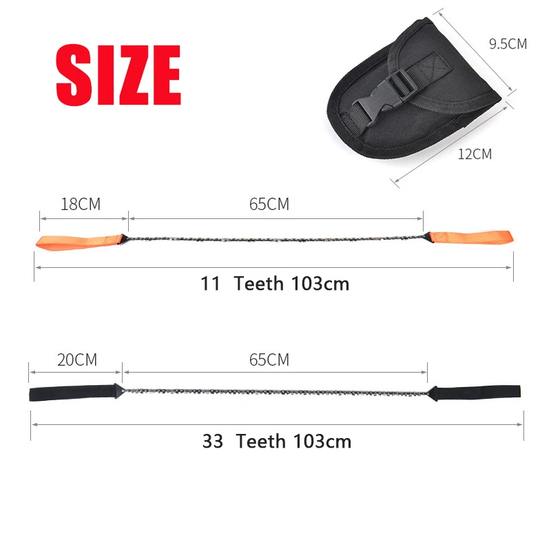 Imagine having this reliable portable zipper saw in your survival gear, ready to tackle any cutting task in the wild. Its bright orange handles shoulder reinforced stitching, ensuring a secure grip even in tough conditions. The flexible chain features closely spaced metallic links, finished with a matte or slightly glossy coating for corrosion resistance, making it both durable and functional. With a total length of 103cm and a cutting length of 65cm, this lightweight tool weighs only 142 grams, allowing you to carry it effortlessly during outdoor adventures. Designed for versatility, it effortlessly cuts wood, plastic, bone, rubber, and soft metals from any angle. Its simple back-and-forth operation makes it easy to use, even in urgent situations. Whether camping, gardening, or survival, this saw offers strength and portability in one sleek package.