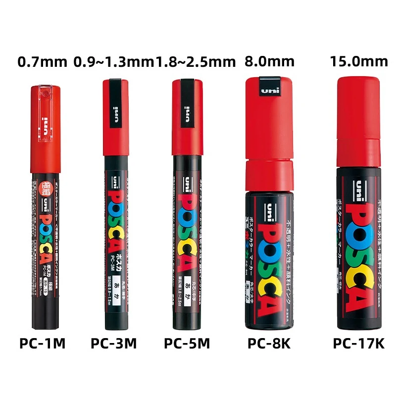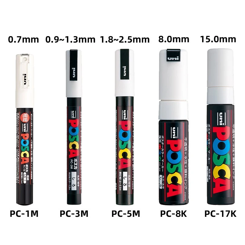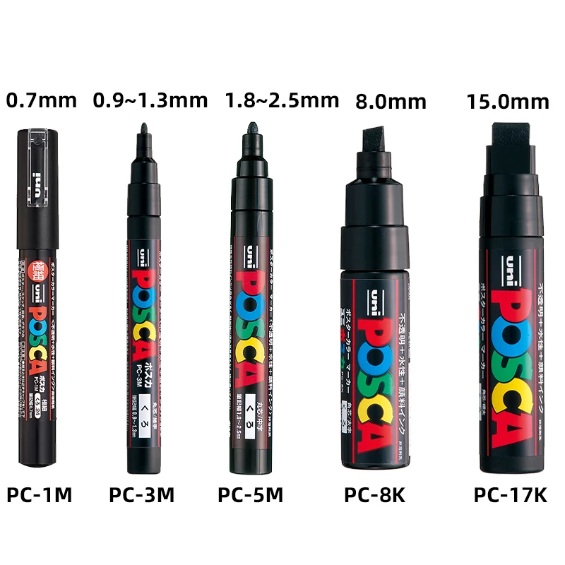 - Includes five markers: PC-1M, PC-3M, PC-5M, PC-8K, and PC-17K, covering a range of sizes for detailed work to broad strokes, ideal for graffiti, ads, and posters.