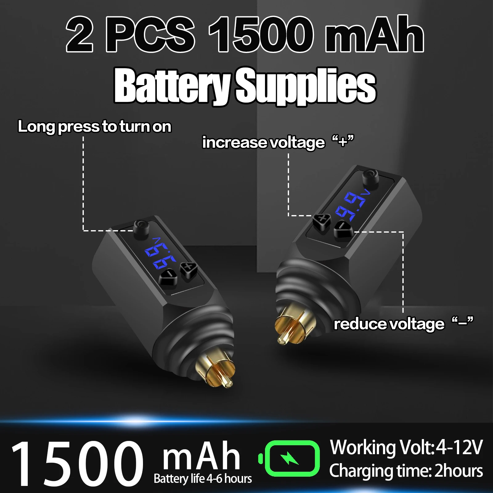 - Includes a wireless power supply; customizable voltage between 4-12V, starting at 8V, allowing for adaptable and controlled tattooing performance.