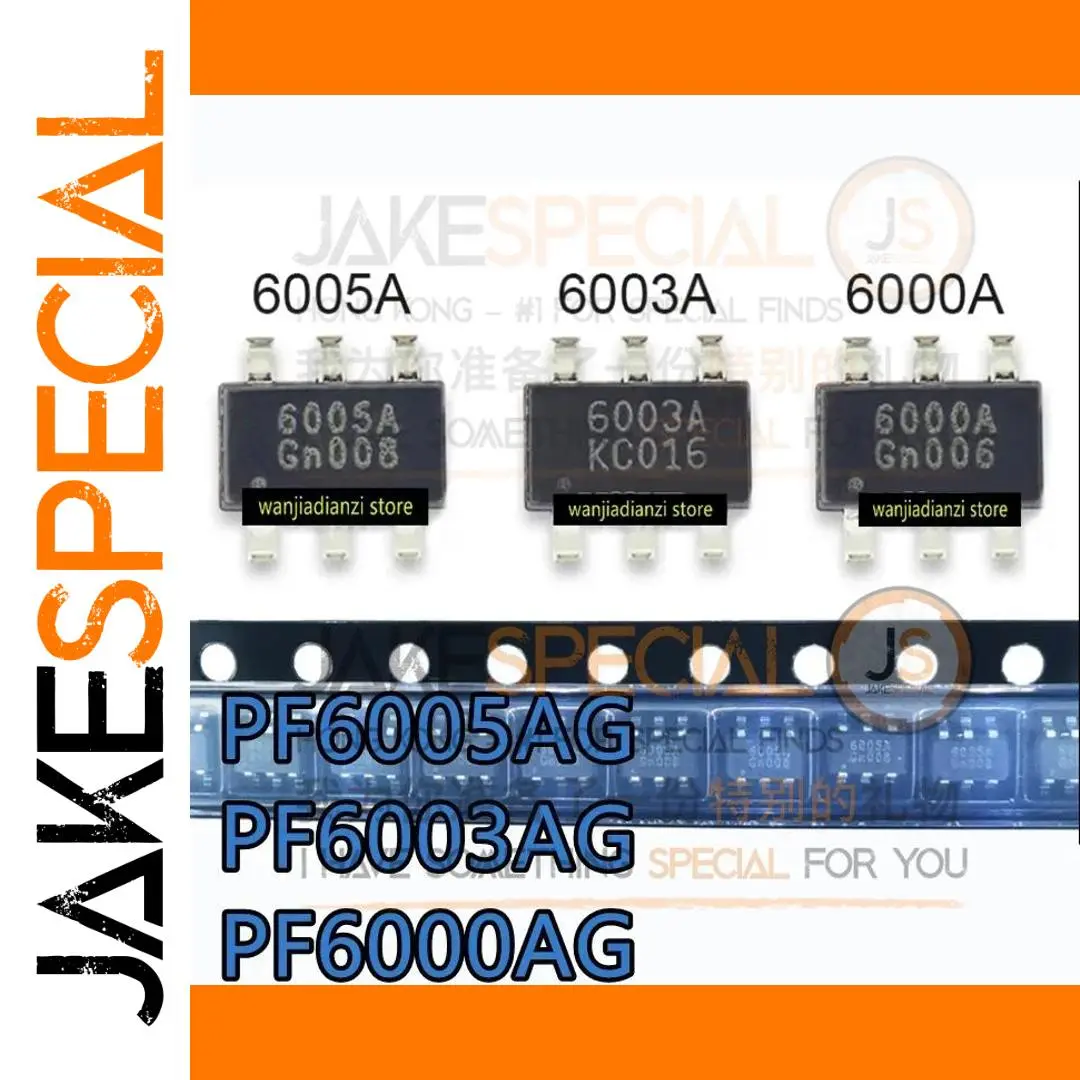 Experience reliable power management with this set of nine SOT23-6 package chips, including five pieces each of models PF6003AG, PF6005AG, and PF6000AG. These compact, black rectangular components feature six pins for surface-mount applications and are designed for precise power regulation. Each chip showcases a sleek, minimalist aesthetic with white printed text contrasting against their matte finish, complemented by subtle metallic pin contacts. Perfect for electronics enthusiasts and professionals seeking quality, tested components to enhance circuit performance. Whether upgrading or repairing, these unbranded, high-quality power management chips provide exceptional durability and efficiency for your projects.