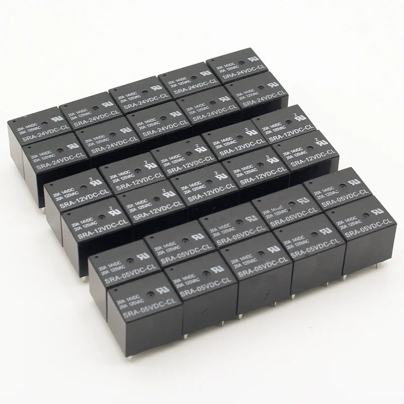 Experience reliable switching with this set of three power relays featuring models with coil voltages of 5V, 12V, and 24VDC. Each compact, black plastic relay has a 5-pin configuration, sealed for protection against dust and moisture, and supports a maximum contact load of 20A for versatile electromagnetic switching. Designed for general-purpose use with DC power sources, these relays are CE certified and customizable for low power applications, making them ideal for professional automation, industrial control, and electronic projects. Their sleek, durable construction ensures long-lasting performance, while the clearly marked terminals allow easy installation and secure connections.
