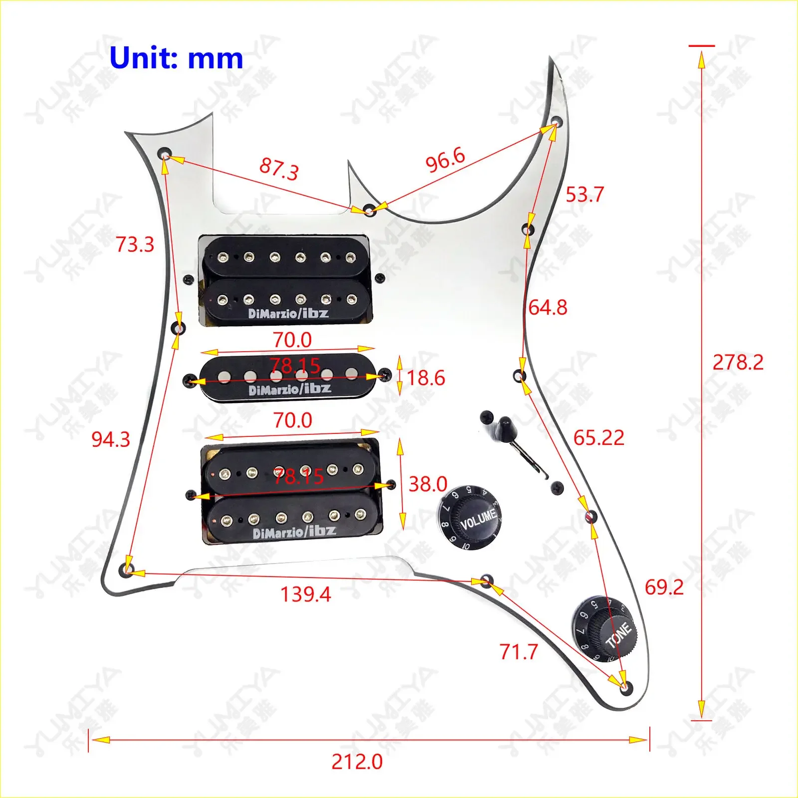 Imagine transforming your RG electric guitar with this stylish, ready-to-install pickguard. Crafted from high-quality metal with a brushed, metallic finish, it exudes modern sophistication. Its clean contours perfectly fit RG or Strat-style body shapes, making it an ideal upgrade or replacement. The bold black mounting plates and control knobs provide a striking contrast against the reflective surface, creating a professional, industrial look. The visible screw holes accentuate its utilitarian appeal, while the protective film keeps the surface pristine during installation. Once installed, you'll enjoy a seamless blend of aesthetic elegance and functional excellence—bringing a fresh, new vibe to your instrument and inspiring new musical creativity.