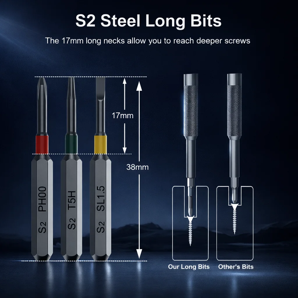 - Includes 36 long S2 steel bits, each 17mm long, with 1/4-inch heads compatible with a wide range of electronic repairs.