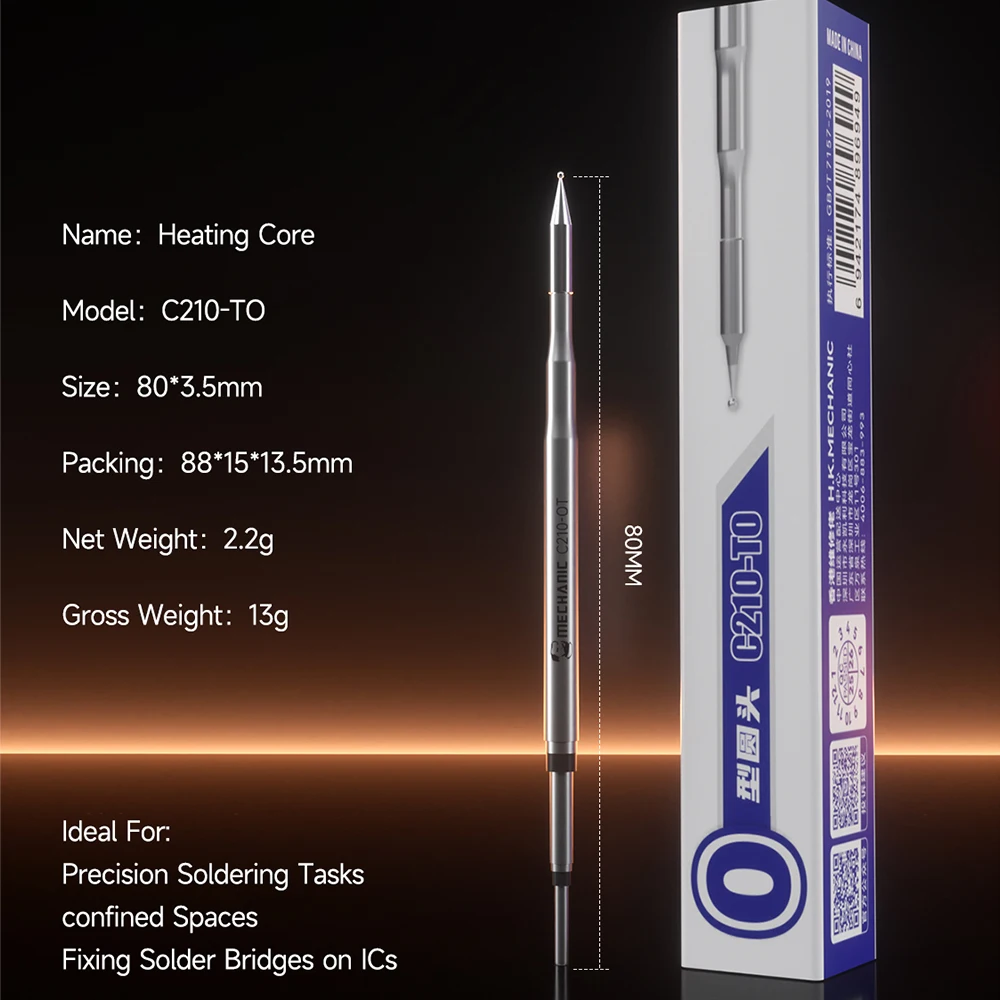 Experience the ultimate in micro-soldering with this high-quality MECHANIC C210-TO integrated ball-tip soldering iron tip. Designed for professional and DIY repairs, its sleek metallic finish and polished spherical tip reflect craftsmanship and durability. The 1.42mm ball head fits perfectly into tight spaces on mobile phone PCBs and dense circuit boards, allowing you to work with confidence on delicate components. Its compact 80mm body ensures comfortable handling, while rapid 1-second heating minimizes downtime. Built with multi-layer anti-corrosion technology, the tip maintains top performance over time, ensuring precise, clean solder joints. With this essential tool, elevate your electronic repair projects to a professional level easily and efficiently.