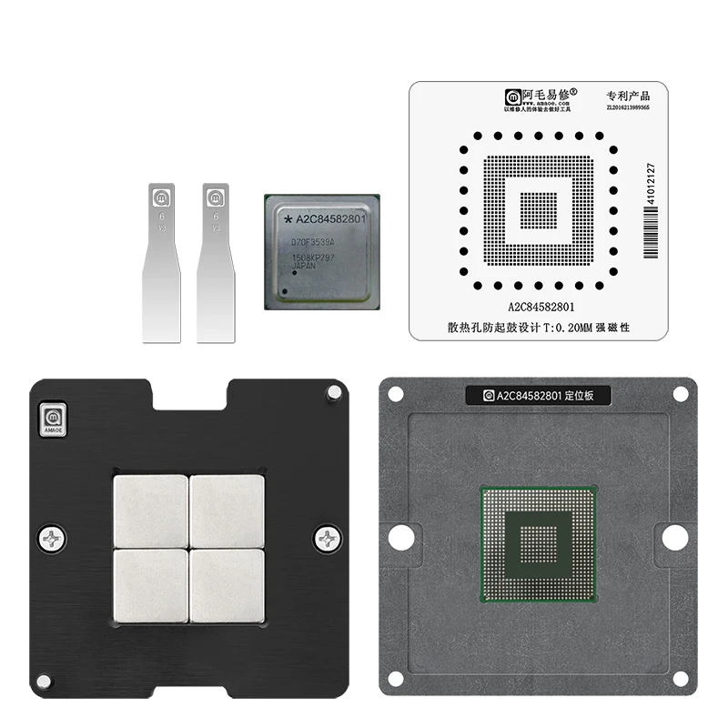 Enhance your electronics repair projects with this high-quality BGA stencil designed specifically for models like D70F3539A, A2C84582801, and A2C85753201. This full set includes a durable metal stencil with a 0.2mm thickness, ensuring precise solder ball placement for reballing and tin planting tasks. The set also features a magnetic base and a positioning plate, making alignment straightforward and secure during delicate repairs. Its sleek, industrial finish highlights the craftsmanship and technical sophistication behind the product. Crafted from non-chemical, eco-friendly materials, it offers a safe, reliable solution for professional and DIY electronics enthusiasts. Visualize yourself completing flawless reballing jobs efficiently with this essential tool.