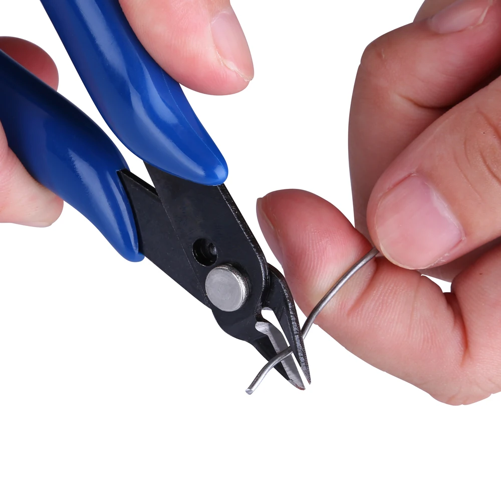 Experience reliable performance with these diagonally designed cutting pliers, crafted from durable carbon steel. Weighing just 55 grams and measuring approximately 125 mm long, they are ideal for electrical, jewelry, or model-making projects. The vibrant blue handles, coated with a smooth rubberized material, provide comfort and a secure grip during prolonged use. Their ergonomic, bent handles assist in applying leverage easily, reducing fatigue. The sharp, precisely beveled jaws ensure clean and accurate cuts on wires, electronic pins, and small metal or plastic components. With a robust rivet joint, they guarantee smooth, effortless opening and closing. These multifunctional pliers combine strength, comfort, and precision for professional or hobbyist use, making your tasks easier and more efficient.