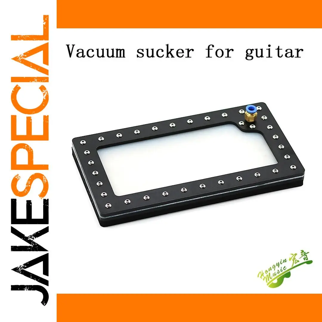 - Technical specifications include aluminum alloy vacuum sucker with brass adapter, 5mm acrylic gauge, multiple arc contours for different guitar radii, and rigid black frame construction.