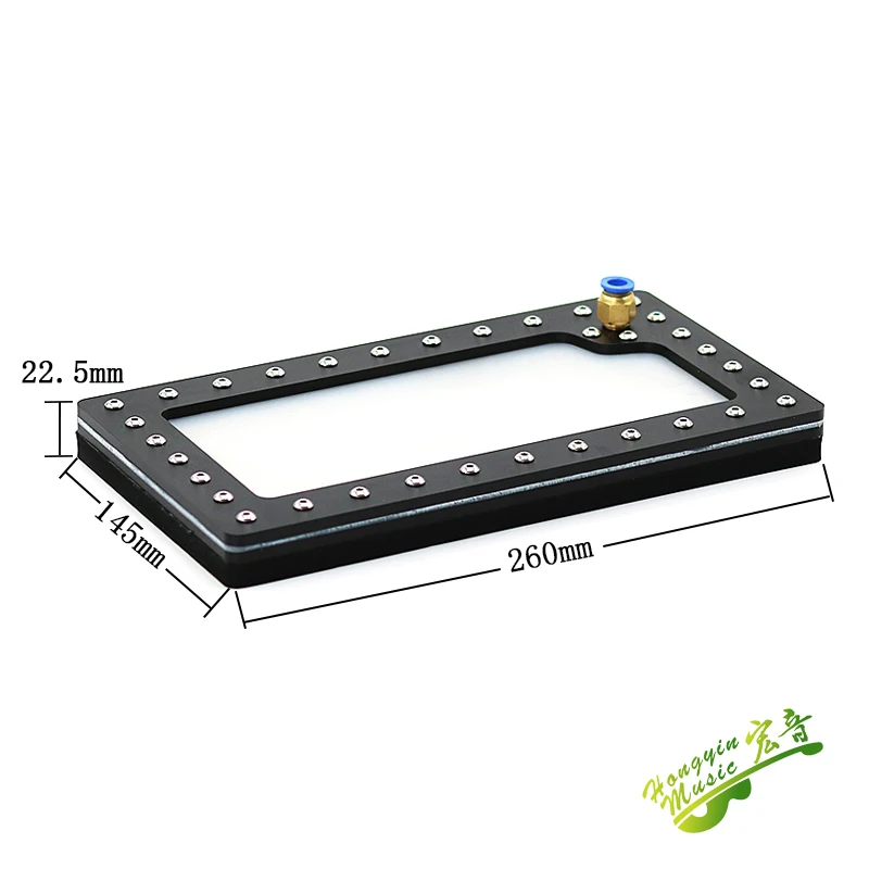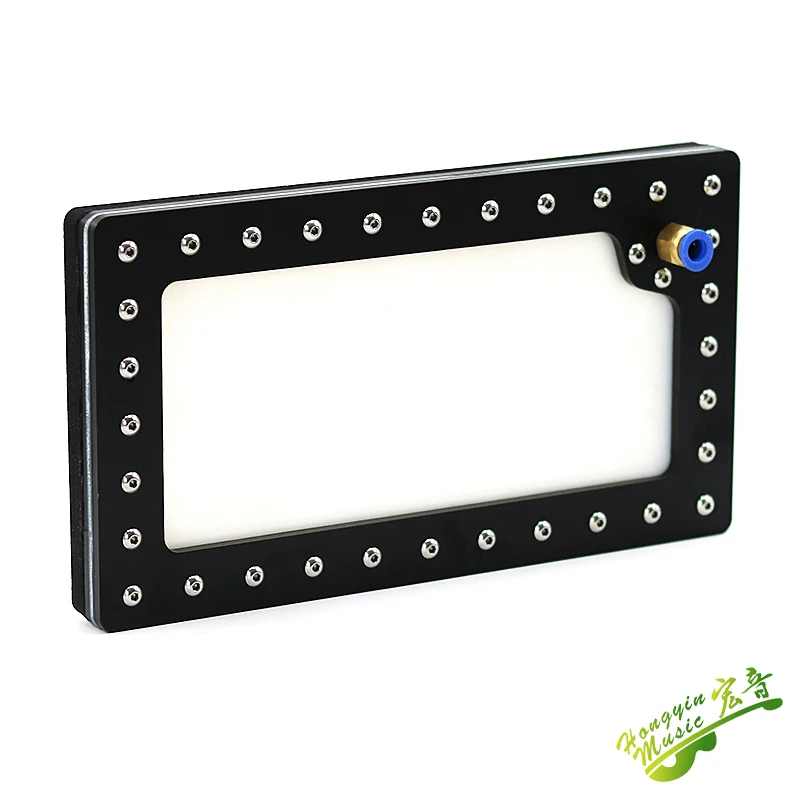 Imagine elevating your guitar setup process with this meticulously designed maintenance tool. Crafted with a sleek, matte-finish black rectangular frame, it combines durability with precision. The embedded acrylic gauge, approximately 5mm thick, features smoothly curved, marked arcs tailored for different guitar types—electric, acoustic, and classical—allowing you to verify and adjust fingerboard radii up to 22″. The polished aluminum alloy vacuum sucker and golden adapter add a touch of industrial charm, providing a secure attachment during maintenance tasks. This innovative tool enables you to fine-tune fingerboard curvature and string height accurately, improving your instrument’s playability. Its ergonomic design simplifies setup, ensuring your guitar performs at peak condition with professional finesse.
