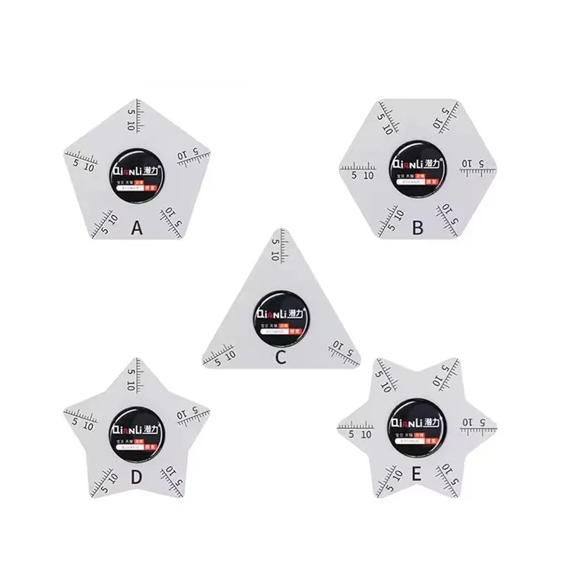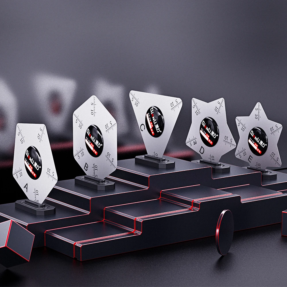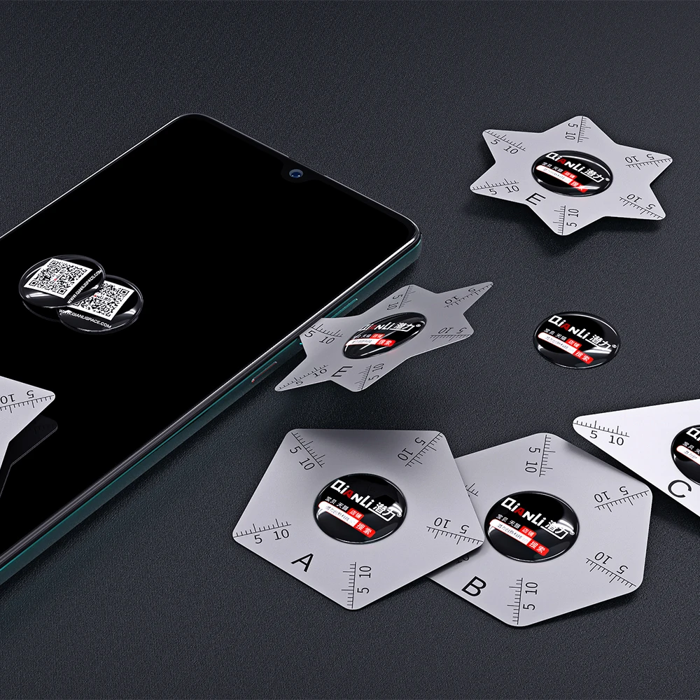 Prepare to elevate your repair skills with this set of five ultra-thin LCD screen disassembly cards. Crafted for precision, these tools are ideal for opening and prying delicate devices like iPhones and Samsung smartphones. The sleek, silver matte-finish design offers a minimalist yet professional look, fitting comfortably in your hand during intricate repair tasks. Each card features distinct geometric shapes—pentagons, a triangle, and star forms with rounded edges—providing multiple leverage points to access screens without damage. The circular black labels with white and red branding, along with measurement markings, add to their technical charm. These ultra-thin tools are perfect for achieving clean disassemblies while maintaining device integrity, making them essential for repair professionals or dedicated enthusiasts.
