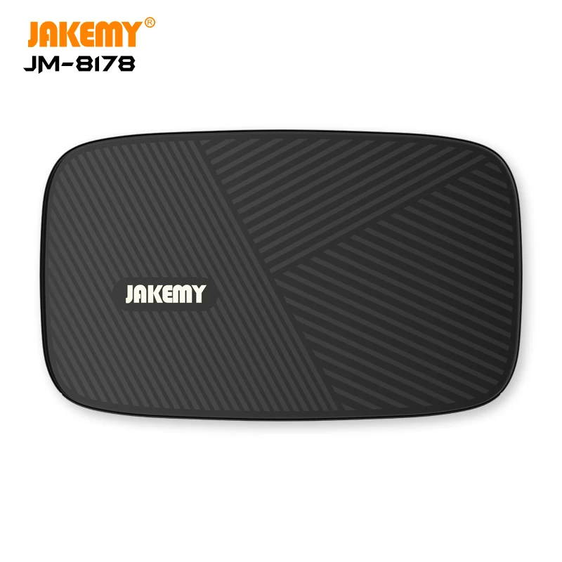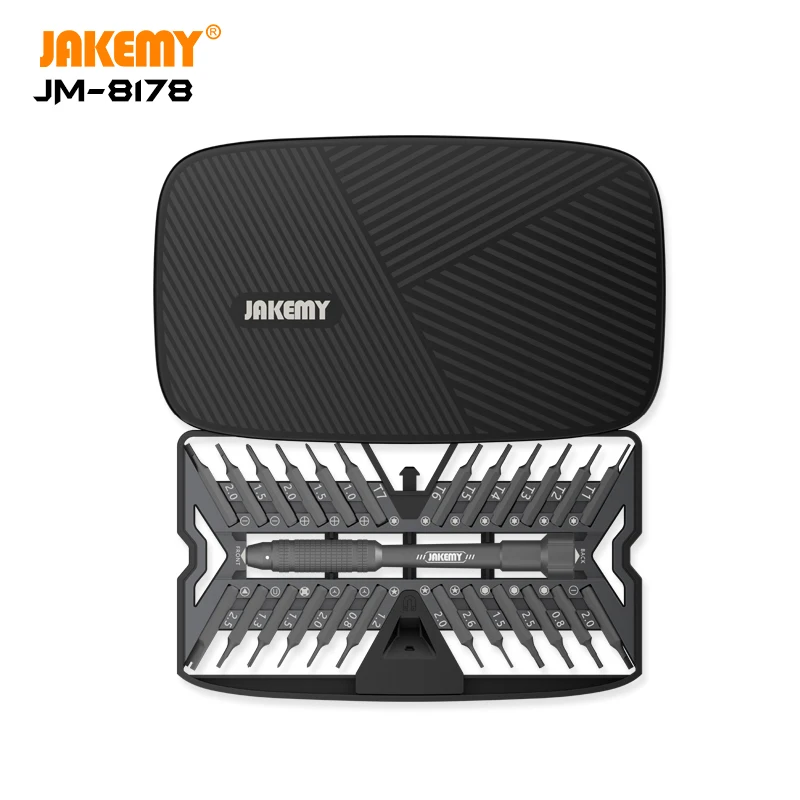 Experience the confidence of tackling delicate electronic repairs with this expertly designed JAKEMY precision magnetic screwdriver set. Featuring a sleek black, rectangular case with a textured surface of diagonal lines, it combines durability with modern aesthetics. Inside, you'll find an organized array of high-quality chrome-vanadium steel bits, shining with a polished finish, and securely held in designated slots. The black, textured handle with knurled grip ensures a sturdy, non-slip hold during use. This versatile set includes a variety of sizes and types—such as slotted, Phillips, Torx, hex, tri-wing, and triangle—making it perfect for repairing mobile phones, tablets, cameras, laptops, watches, and glasses. Its lightweight, dismountable design makes it an ideal companion for both professionals and enthusiasts on the go.