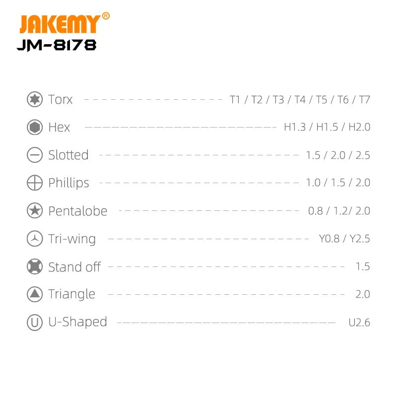 Feel confident knowing you have the right tools at your fingertips. This JAKEMY precision screwdriver set is the perfect addition to your toolkit, whether you're repairing a smartphone or fine-tuning your glasses. Designed for durability, precision, and comfort, it offers professional-grade performance that makes every repair easier. Invest in quality tools today and experience the satisfaction of completing repairs with confidence and ease. This set is your reliable partner for all your electronic maintenance tasks, ensuring your tools are always ready when you need them.