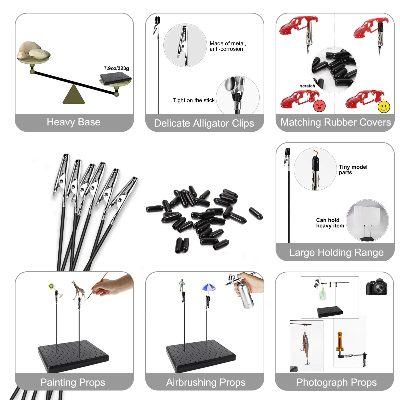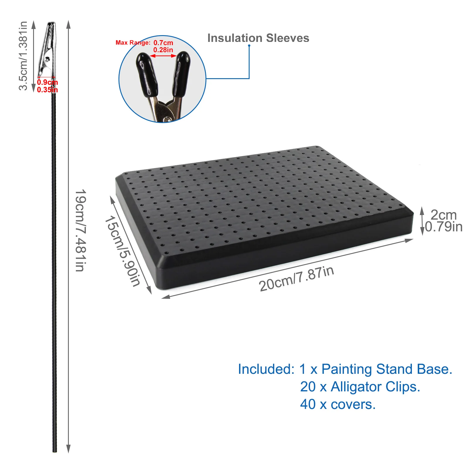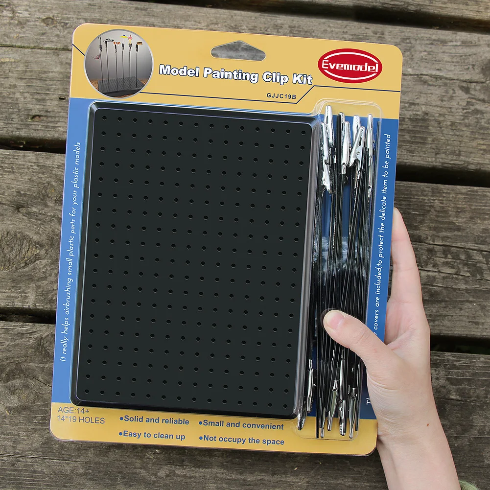 Enhance your mini model painting and airbrushing experience with this Evemodel set, featuring a durable 14 x 19 cm plastic stand base with a perforated surface and 20 black alligator clips with rubber covers. The clips, equipped with two rubber covers each, securely hold small parts for precise detailing, while the black finish and subtle design patterns add a professional aesthetic. This set is ideal for hobbyists aged 14 and above who seek stability and convenience during meticulous painting tasks. Whether you’re customizing models or working on delicate components, this comprehensive toolkit ensures comfortable handling, accuracy, and a clean workflow, making your creative process seamless and enjoyable.