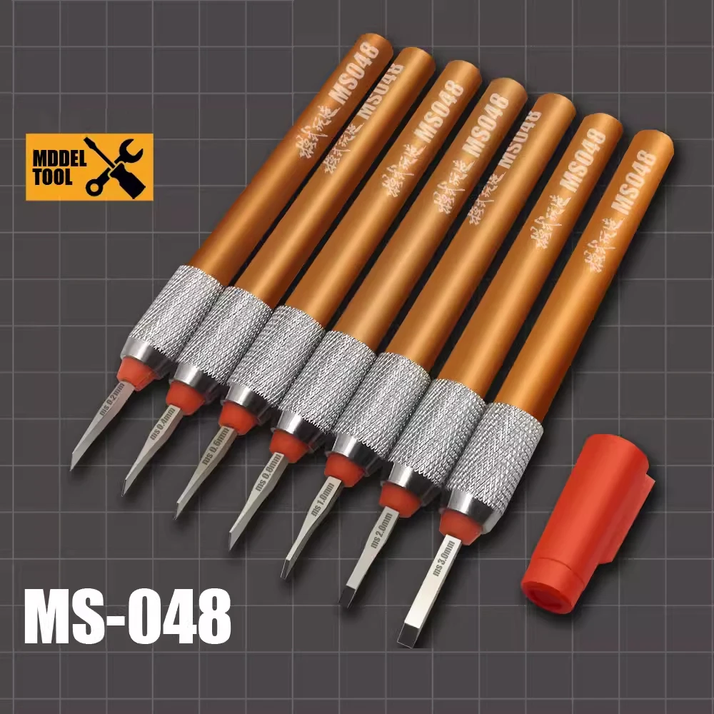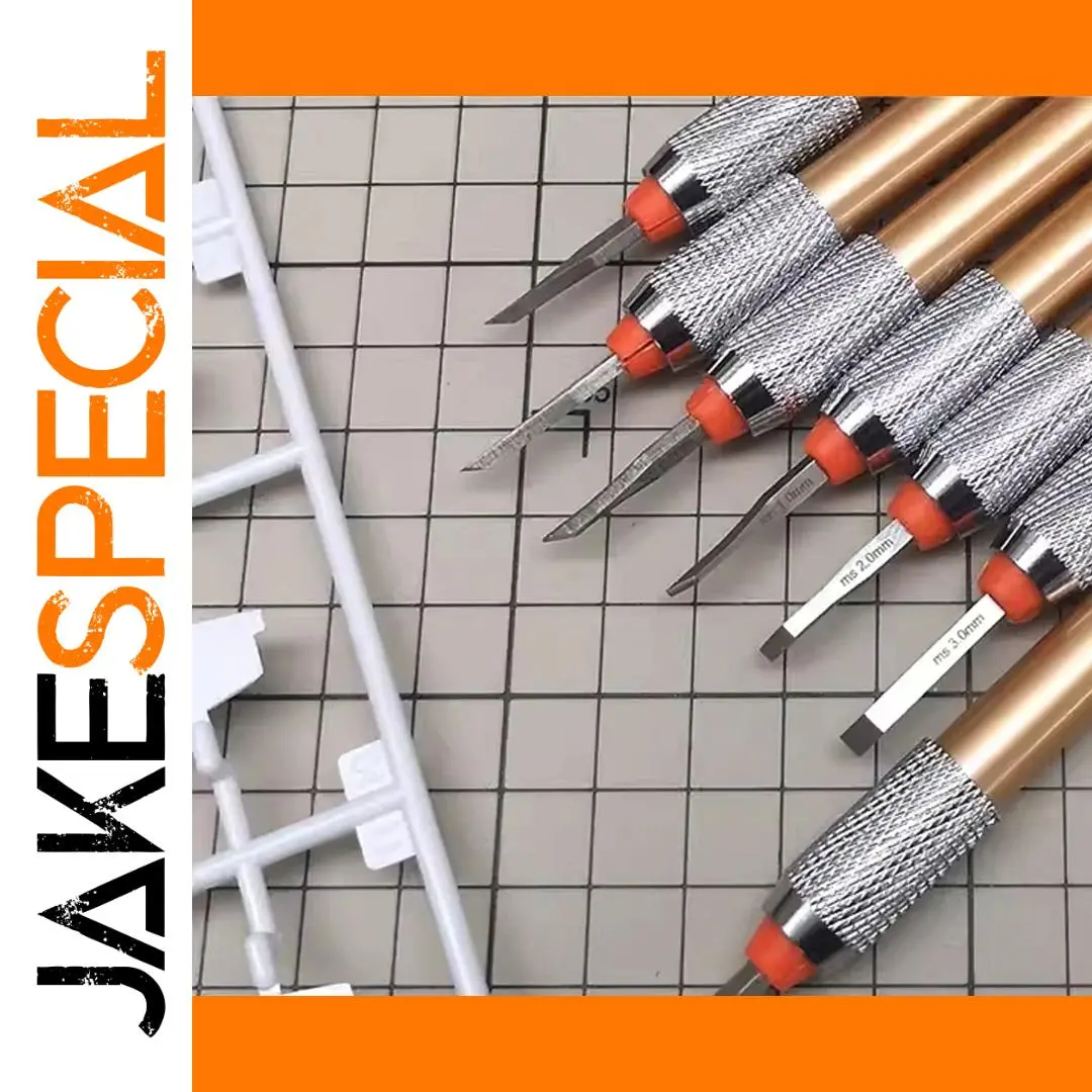 Experience the satisfaction of creating intricate designs with this high-quality modeling and carving tool set. Designed with a sleek metallic finish and comfortable, lightweight aluminum alloy handles, these tools provide excellent grip with textured knurled surfaces for precision work. The set includes eight different sizes, ranging from 0.15mm to 3mm, allowing you to tackle delicate detailing or broader carving tasks on materials like ABS. The vibrant orange and black twist-lock mechanisms securely hold high-speed steel or tungsten carbide blades, offering sharp, durable tips for fine engraving, deepening, and removing excess detail. Whether you are a hobbyist or a professional, this organized and professional-grade kit elevates your crafting and model-making projects to new heights of finesse.