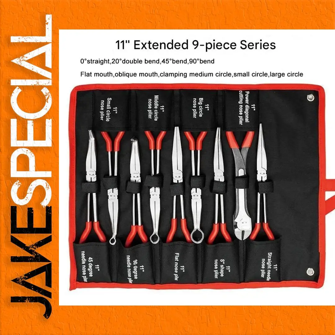- Includes 11-inch pliers with multiple bends at 0°, 20°, 40°, and 90°, plus diverse mouth styles designed for accessing narrow or confined spaces.