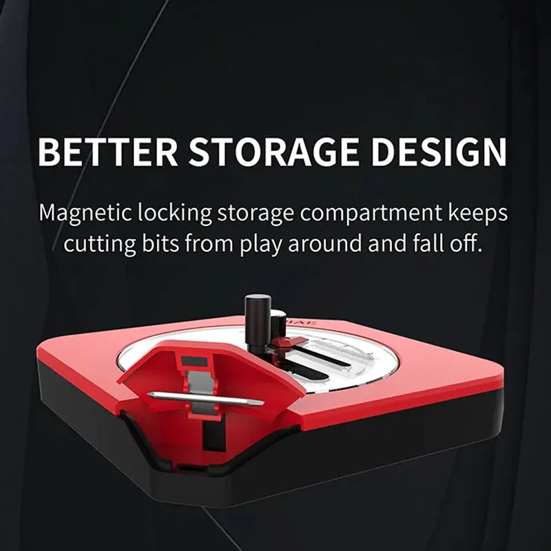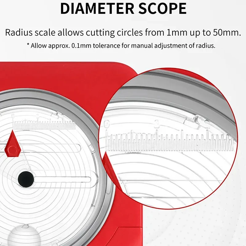 Experience precise circle cutting with this stepless integral circular cutter, featuring a tungsten cutting bit for accurate model making. Crafted from durable aluminum alloy, ABS, and PC, it offers an adjustable diameter range from 1mm to 50mm, allowing for seamless customization. Available in vibrant red and black accents in colors PT-C and PT-C with MT-CB, its sleek, compact design combines modern aesthetics with robust functionality. The circular dial with clear concentric circle grid ensures accurate measurement and adjustment, while the black knob and red triangular marker facilitate easy control and locking of the desired diameter. Ideal for detailed, professional modeling and craft projects.