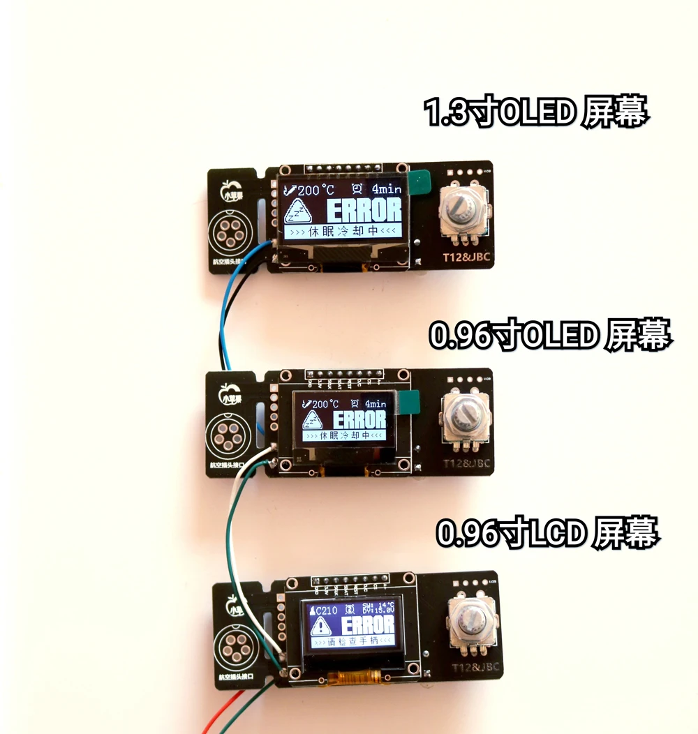 Experience seamless control and precise temperature management with this high-quality control board designed for compatible soldering stations like T12, JBC245, 210, and 936. Its sleek design features a rectangular layout with a stunning 0.96-inch OLED display, or a larger 1.3-inch OLED on alternative models, positioned centrally for easy visibility. The displays showcase real-time data, icons, and error messages with sharp clarity, enhancing your operational confidence. The silver-colored rotary encoder knob offers tactile control, with a textured grip for effortless adjustments. The circuit around the display is populated with small, precise electronic components that reflect superior craftsmanship. With modern aesthetics, this control board is both functional and stylish, perfect for professional or DIY soldering setups aiming for optimal performance and reliability.
