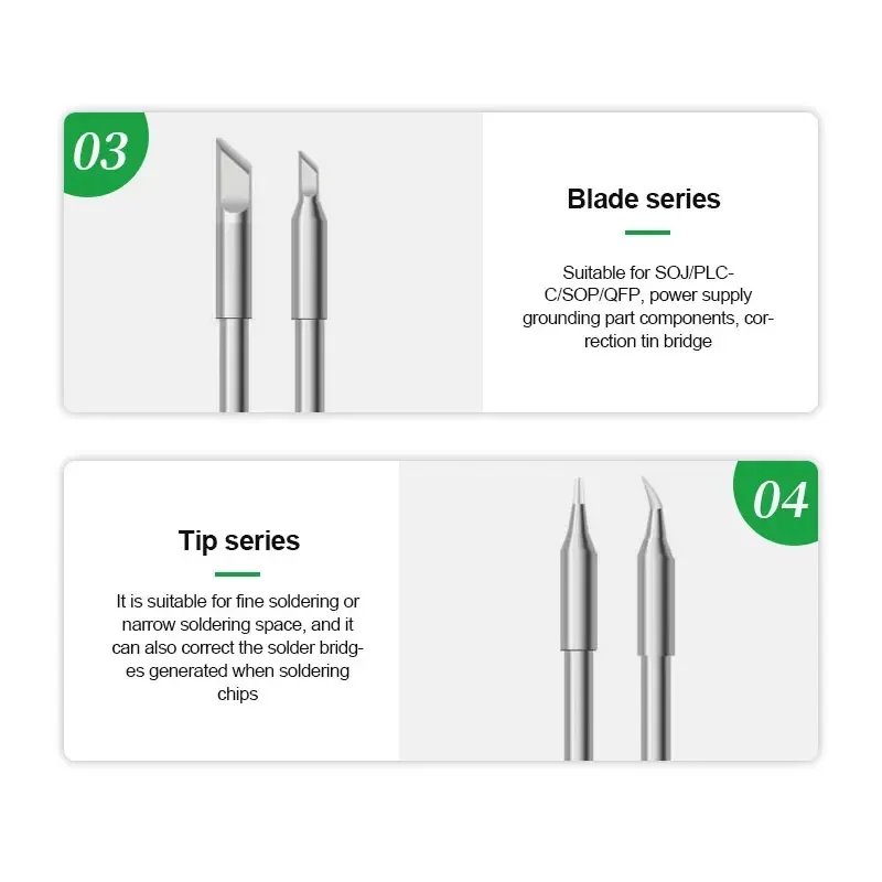 - Includes a variety of tip styles such as straight, angled, and knife heads, designed for precision work on different soldering joints and tight spaces.