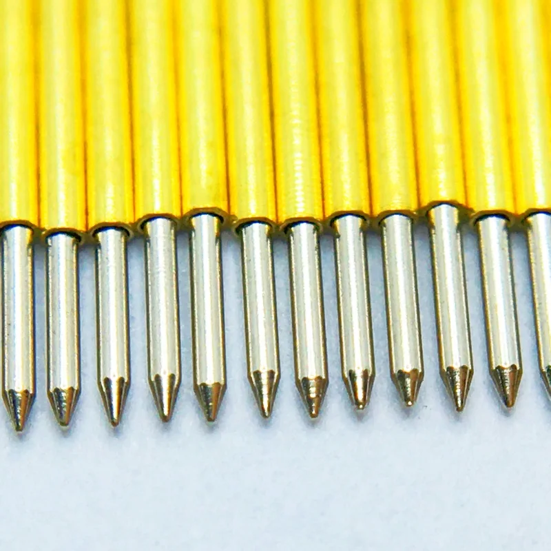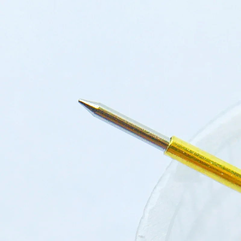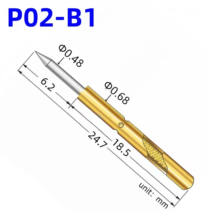 Experience precise electronic testing with the P02-B1 spring test probe, featuring a 24.7mm total length, 0.68mm barrel diameter, and a sharp, nickel-plated 45° needle tip with a diameter of 0.48mm. Crafted from brass or copper for optimal conductivity, this probe supports a 4.0mm working stroke and exerts a spring force of 90g at full extension, rated for a 1A current load with a 50 milliohm contact resistance. Its design includes a 0.90mm hole compatibility and 1.27mm contact grid spacing, with customizable spring forces of 40g or 120g, offered in packages of 20 or 100 pieces, making it ideal for high-precision circuit testing applications.
