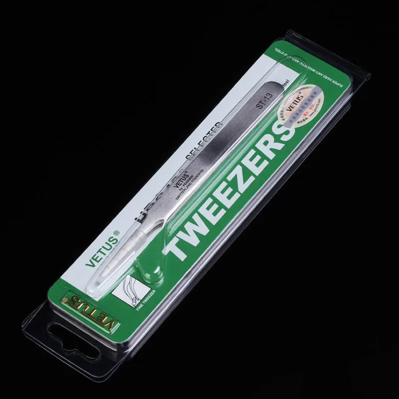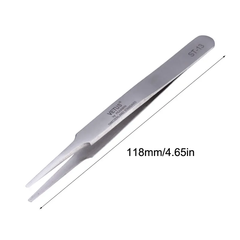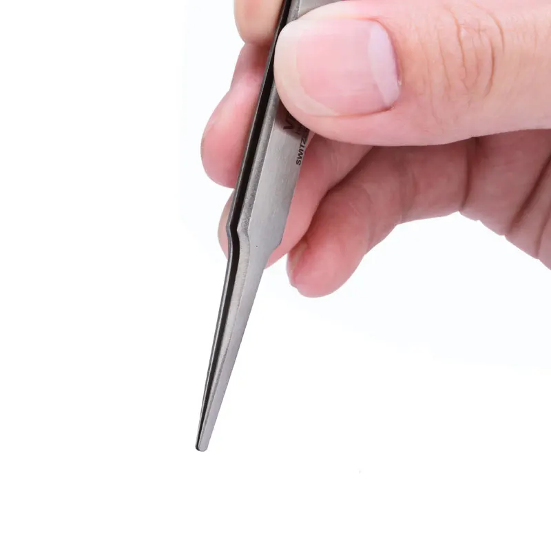 Vetus Switzerland Precision Tweezer model ST-13 is crafted from customizable stainless steel with a hardness rating of HRC-40, offering durability and precision. Featuring a straight, ergonomic handle and narrow, slightly inward-curved tips, this multifunctional tool is ideal for delicate electrical tasks. Measuring approximately 10 to 15 centimeters in length, it provides a clean, professional, and minimalist aesthetic suitable for professional electricians and DIY enthusiasts. Its flat, tapered tips ensure a secure grip on small components without slipping, making it perfect for precision gripping in intricate electrical and technical applications.