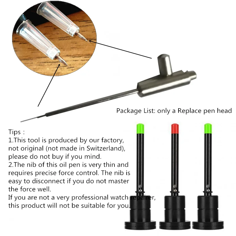 This precision replacement pen tip designed for automatic watch oiling tools offers three models: 1A, 2A, and 3A, with a very thin, elongated stainless steel tip weighing just 10 grams. Crafted for professional watch repair, the tip’s fine taper enables meticulous application of lubricant to tiny components, ensuring precision and control during maintenance. The handle features a textured dark finish, providing a comfortable grip while maintaining a sleek, minimalist aesthetic. Designed exclusively for compatible oil pens sold in our store, it demands careful handling during installation to prevent damage. Ideal for advanced watchmakers, this durable and high-quality component elevates your repair toolkit for precise, reliable performance.