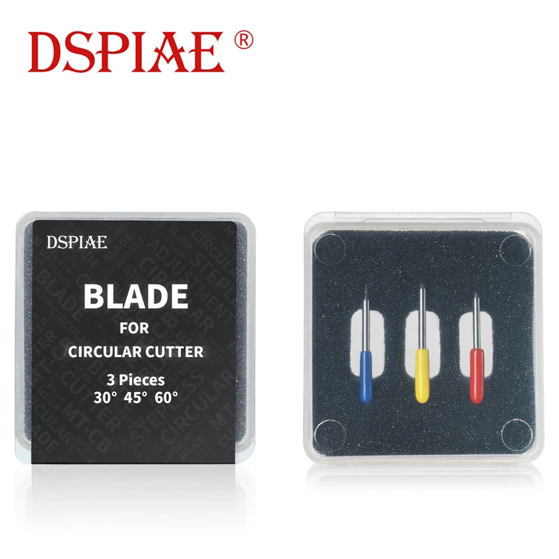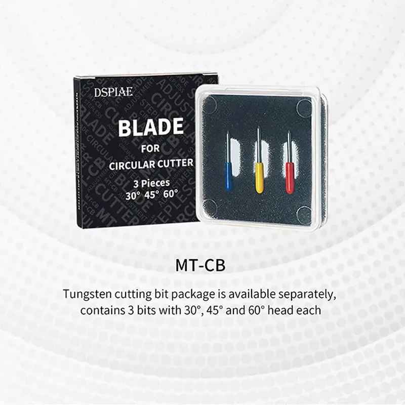 Experience precision with this set of three tungsten steel blades designed for circular cutter accessories. Crafted from durable alloy steel, these blades offer sharp, clean cuts ideal for detailed DIY projects. Each blade features a sleek, elongated shape with a polished metallic surface that reflects light, emphasizing their high craftsmanship and durability. The blades are color-coded in blue, yellow, and red, indicating 30°, 45°, and 60° angles respectively for easy identification and versatility. Perfectly compatible with PT-C, MT-C, and MT-EC models, these blades enhance your cutting precision and efficiency. They come neatly packaged in a clear box with secure foam inserts, ensuring safe storage and handling, ready for professional or personal use.