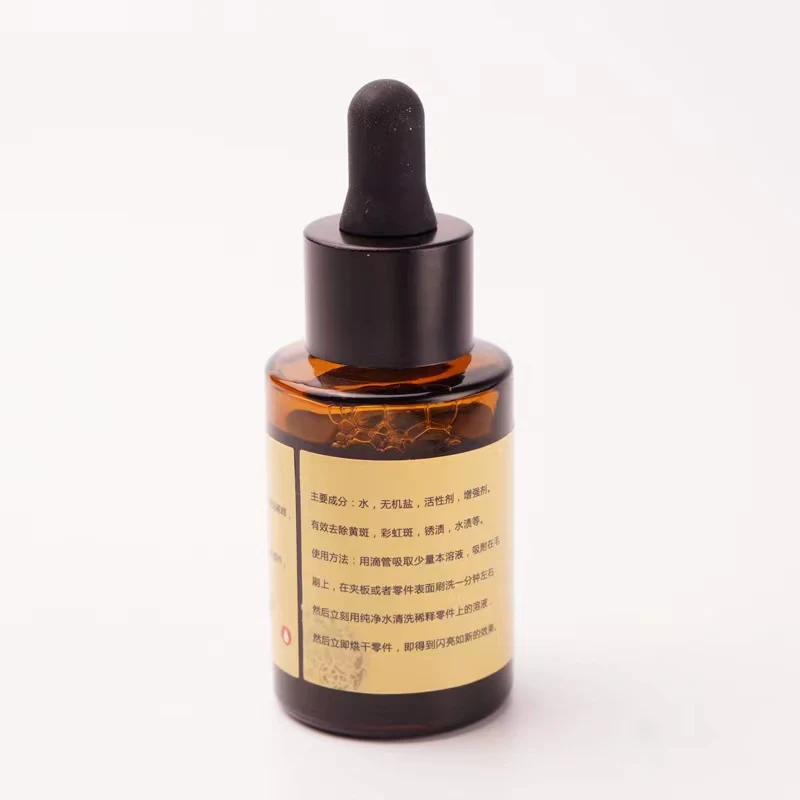 Experience the exceptional cleaning power of this sleek, transparent amber glass bottle designed for watchmakers and enthusiasts. Its compact, sturdy cylindrical shape offers easy handling and precise application. The black screw-top cap with a built-in glass dropper ensures accurate dosing and minimal waste. The elegant cream-colored label features subtle Chinese characters and simple English text, emphasizing its professional purpose. Ideal for maintaining high-end watches, it allows you to confidently clean movement parts and eliminate rust, keeping your timepieces in pristine condition. The warm amber tones combined with the clear, glossy surface give this product a refined and understated aesthetic, blending functionality with style for serious collectors and professionals alike.