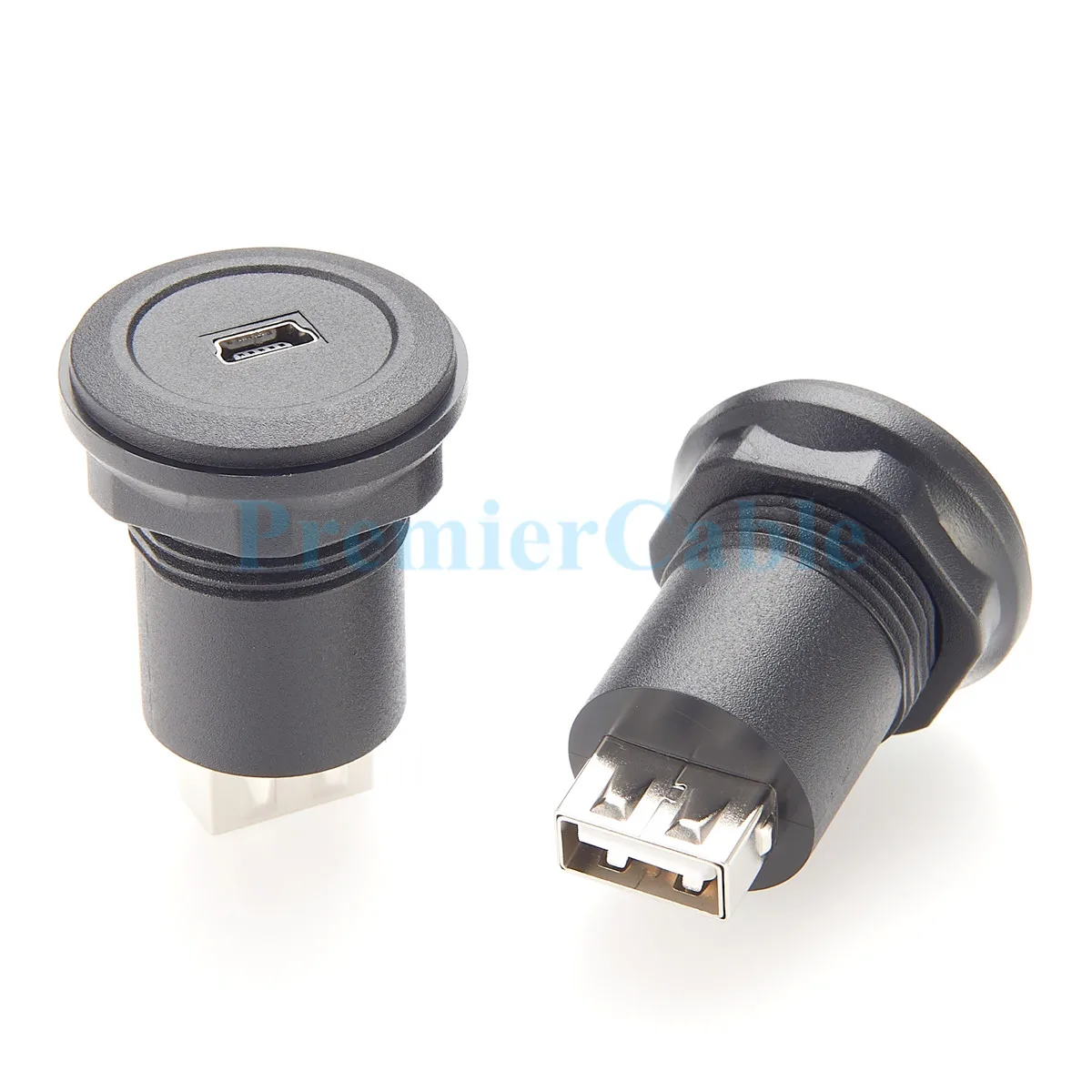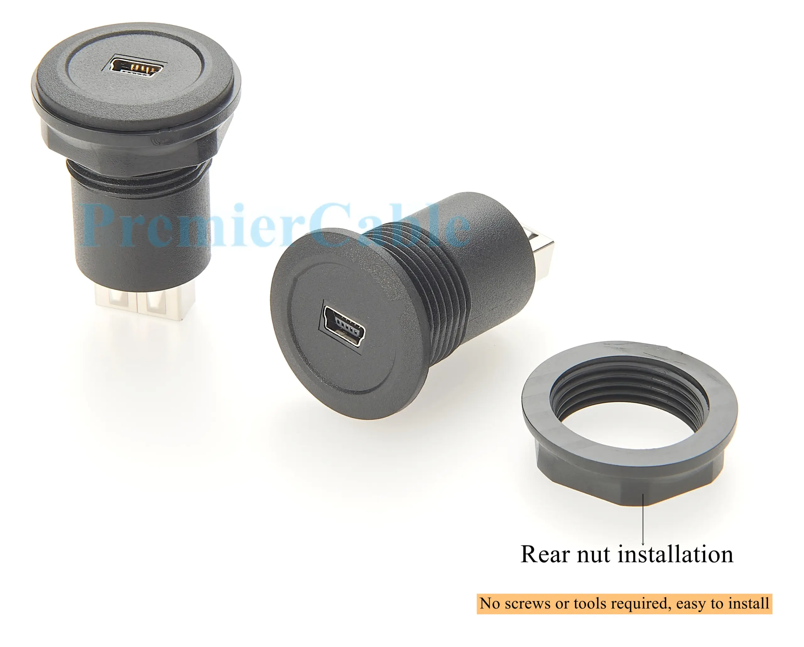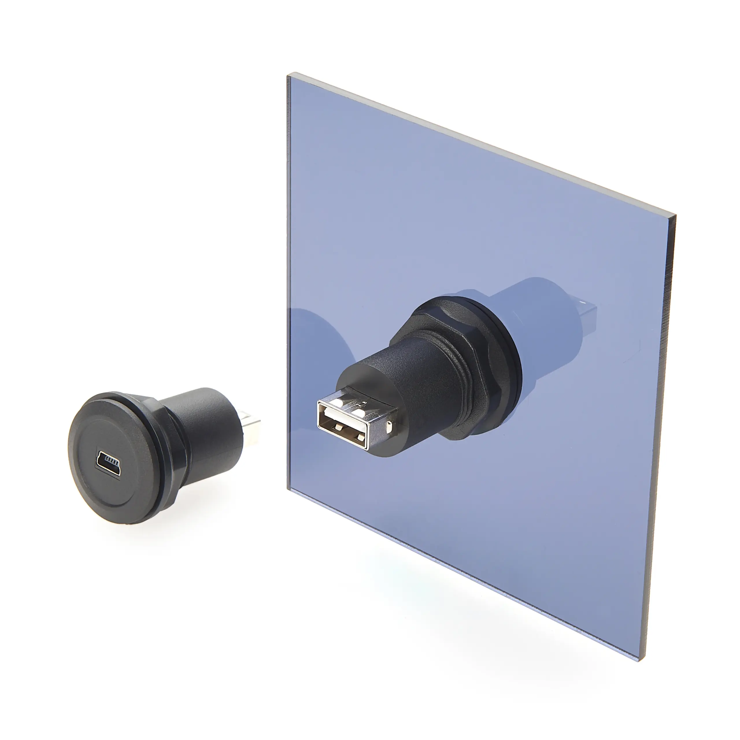 - Contains a Mini USB Female connector inset into the flat front face, combined with a USB 2.0 Type A Female port on the rear, supporting fast data transfer and secure connections in various environments.
