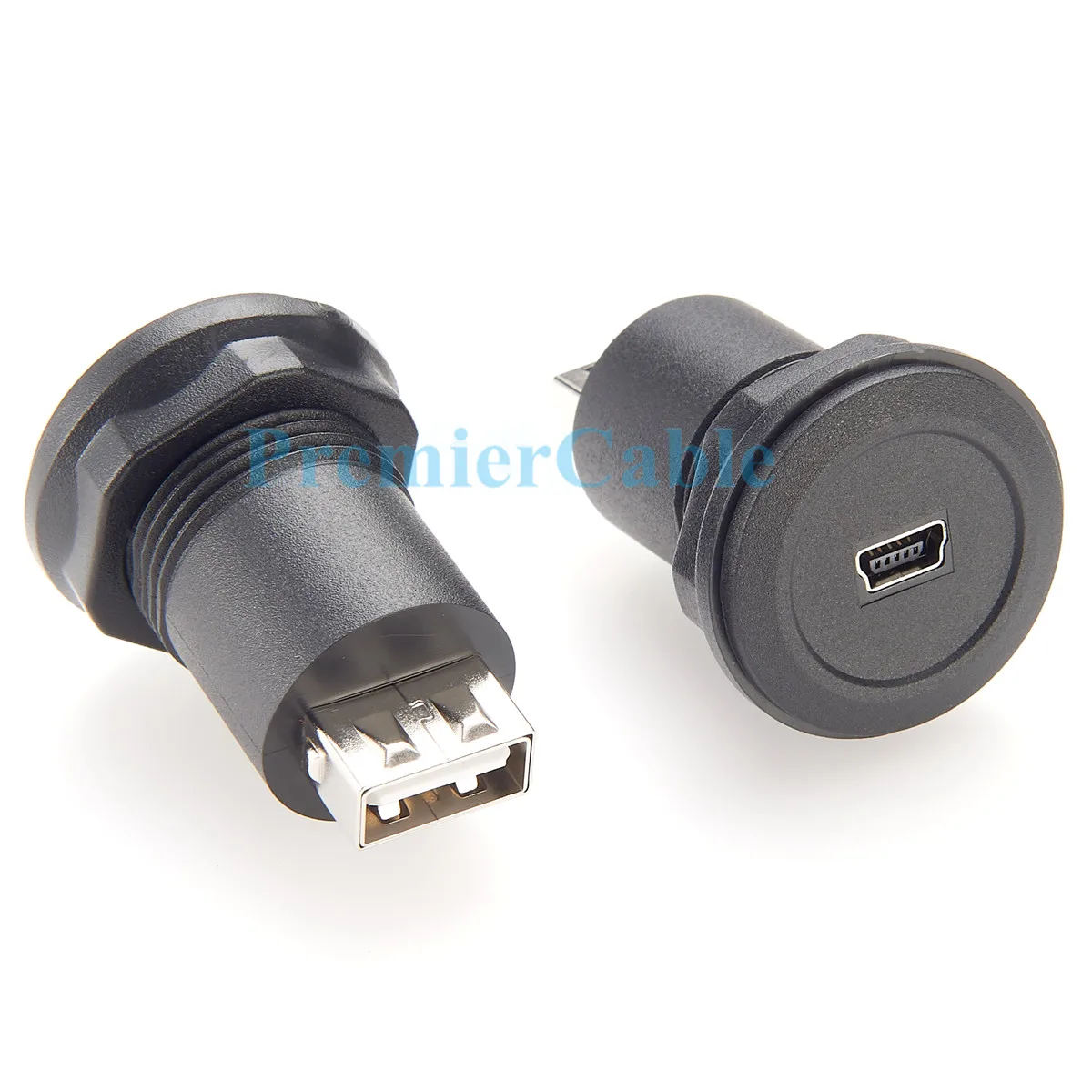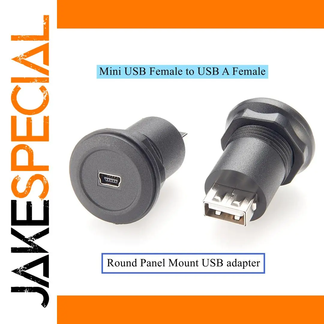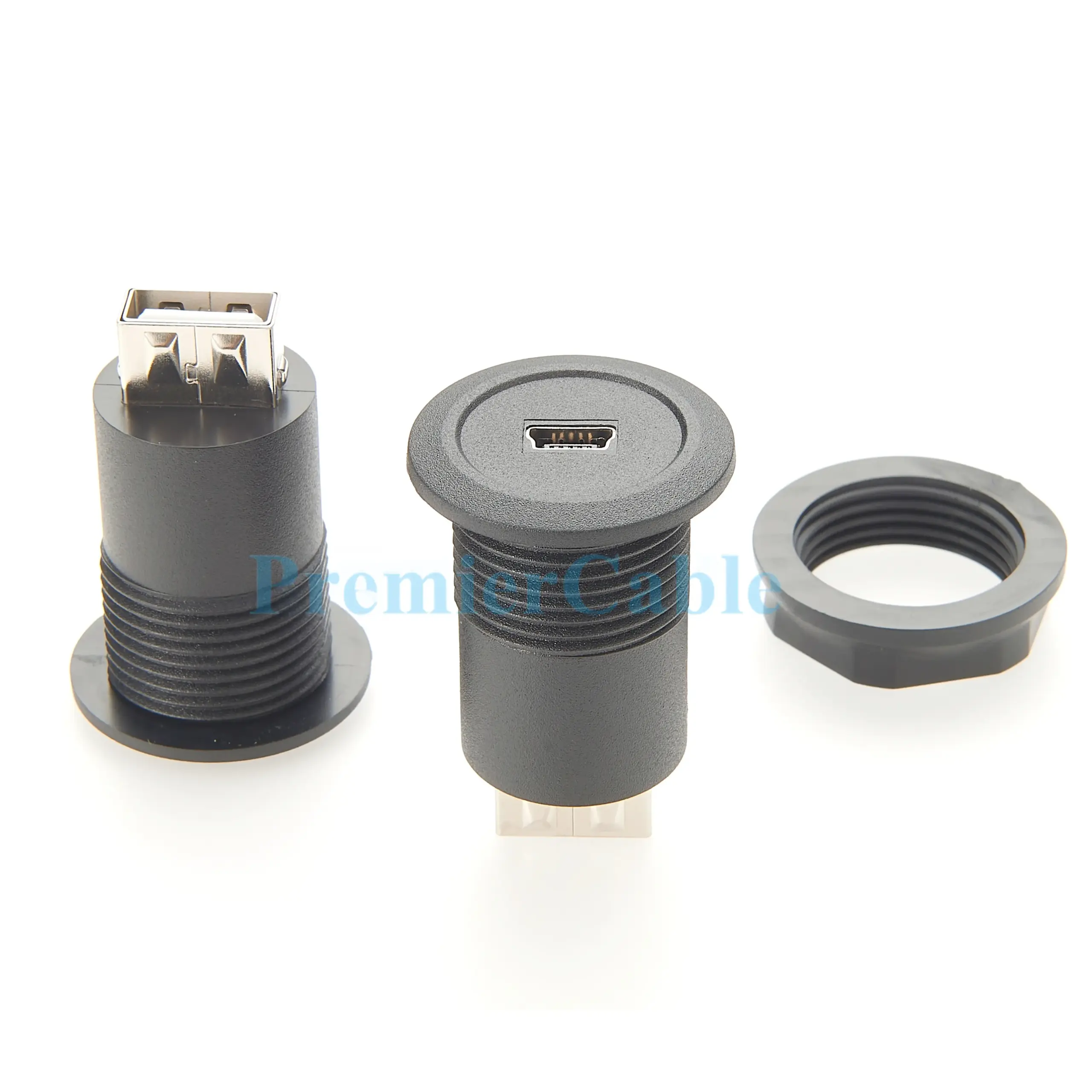 - Contains a Mini USB Female connector inset into the flat front face, combined with a USB 2.0 Type A Female port on the rear, supporting fast data transfer and secure connections in various environments.