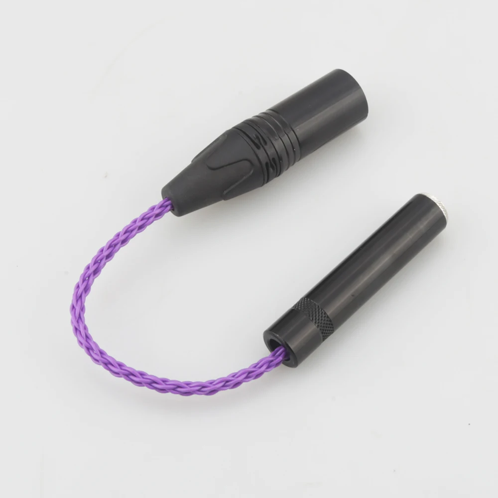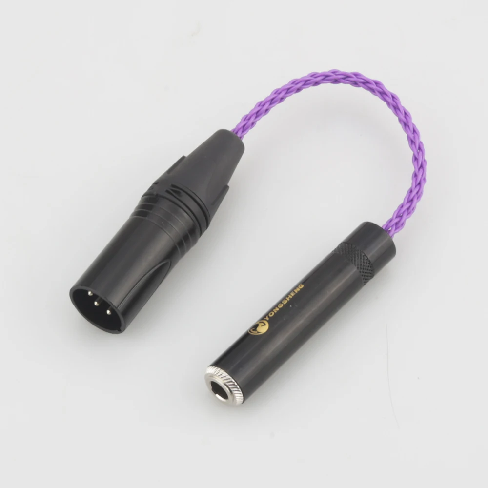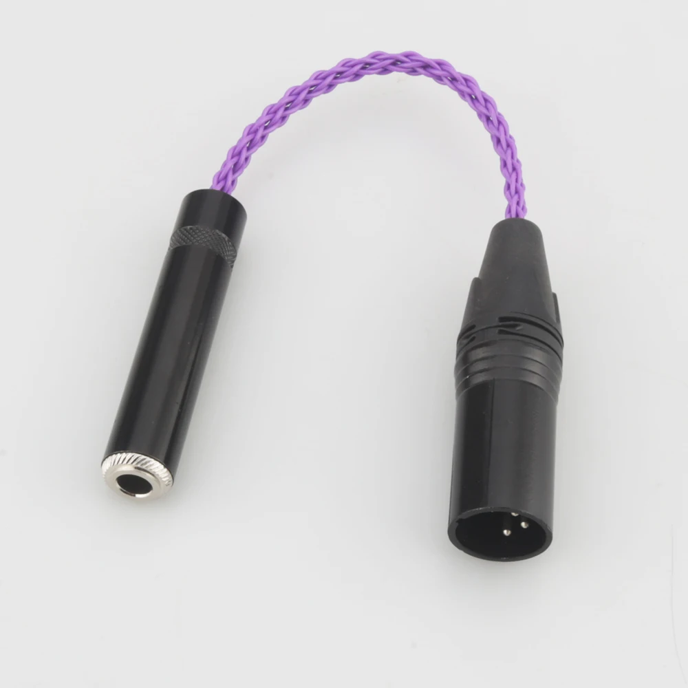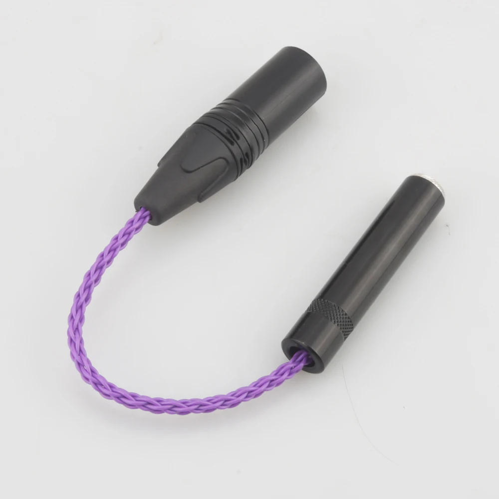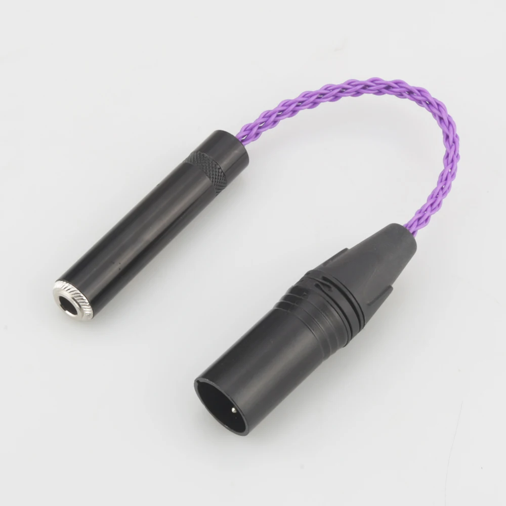 Experience superior sound quality with this handcrafted 10cm audio adapter cable, expertly designed for professional audio connections. Featuring a sleek black matte finish, the high-grade 4-pin XLR male connector offers durability and precision with polished metal pins inside. The 6.35mm female jack, also in matte black with gold embossed lettering “VONOGUSHINE,” is built for secure, high-quality connections. The transparent purple Teflon insulator sleeve reveals the intricate braided Litz geometry of eight 7N OCC single copper cores, ensuring optimal signal transmission. Designed with meticulous craftsmanship, this cable delivers clarity and reliability, perfect for critical audio setups like microphones, mixers, or musical instruments, elevating your sound experience for audiophiles and professionals alike.