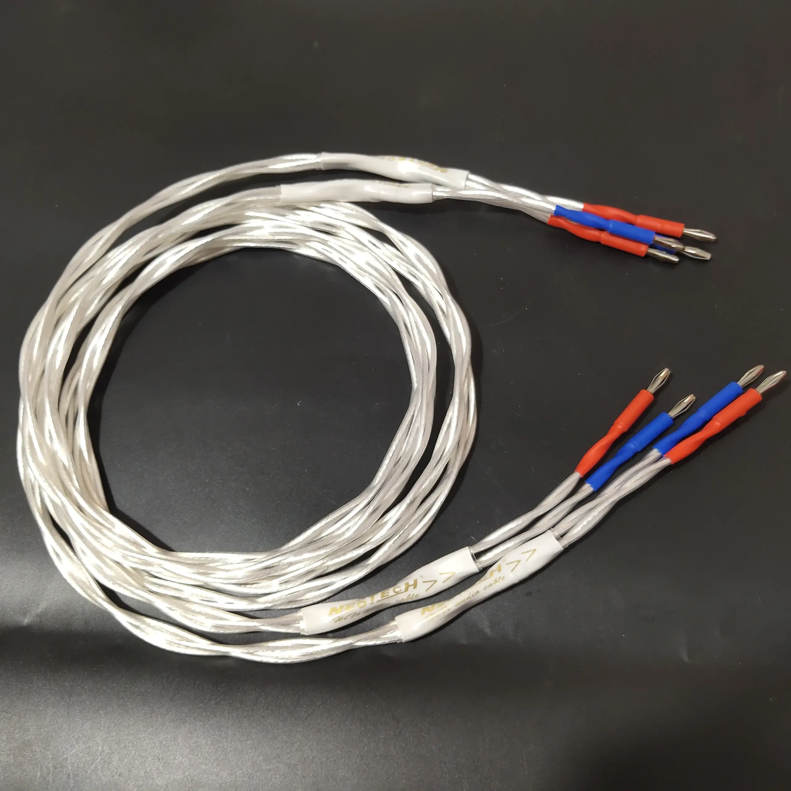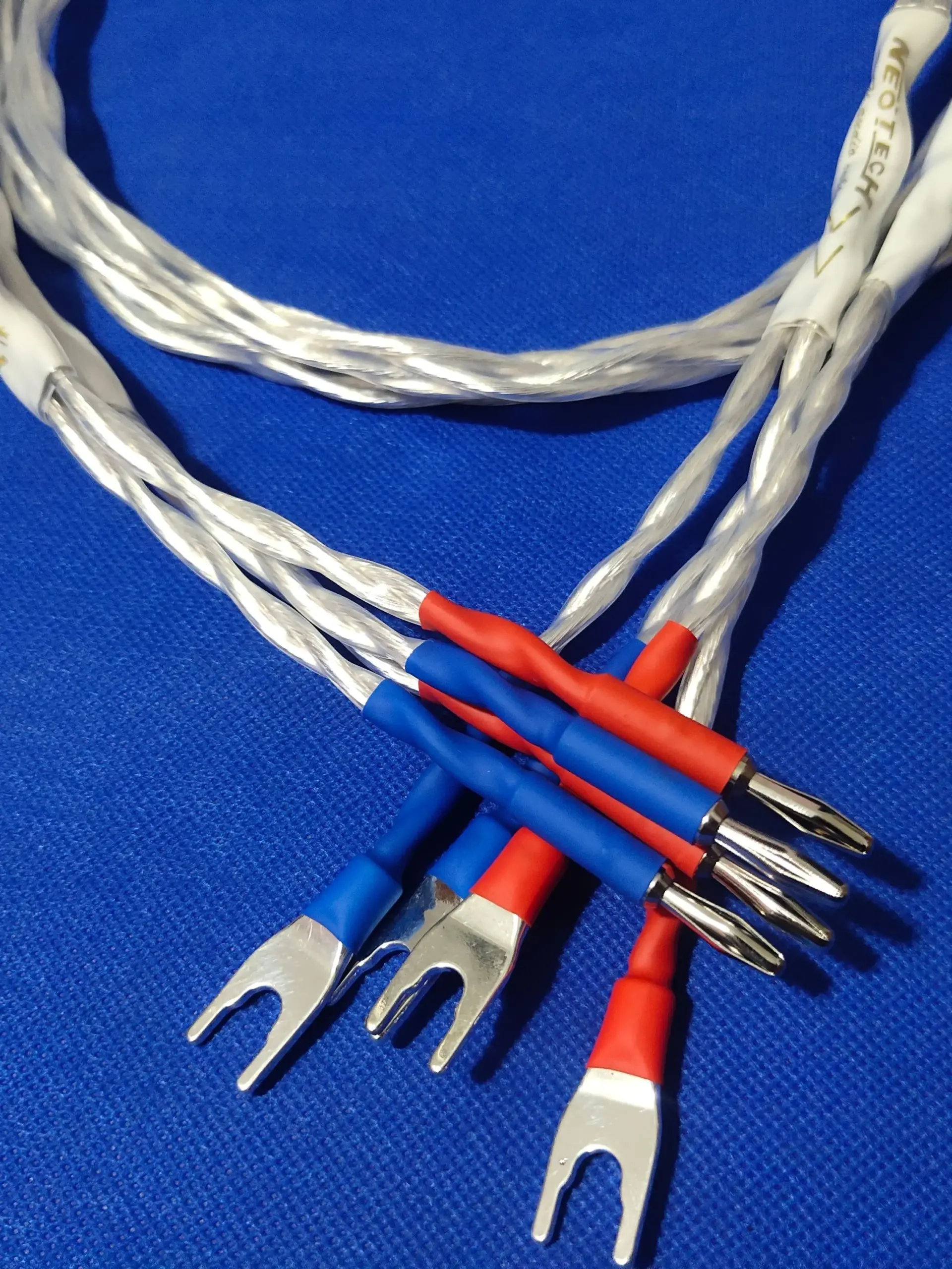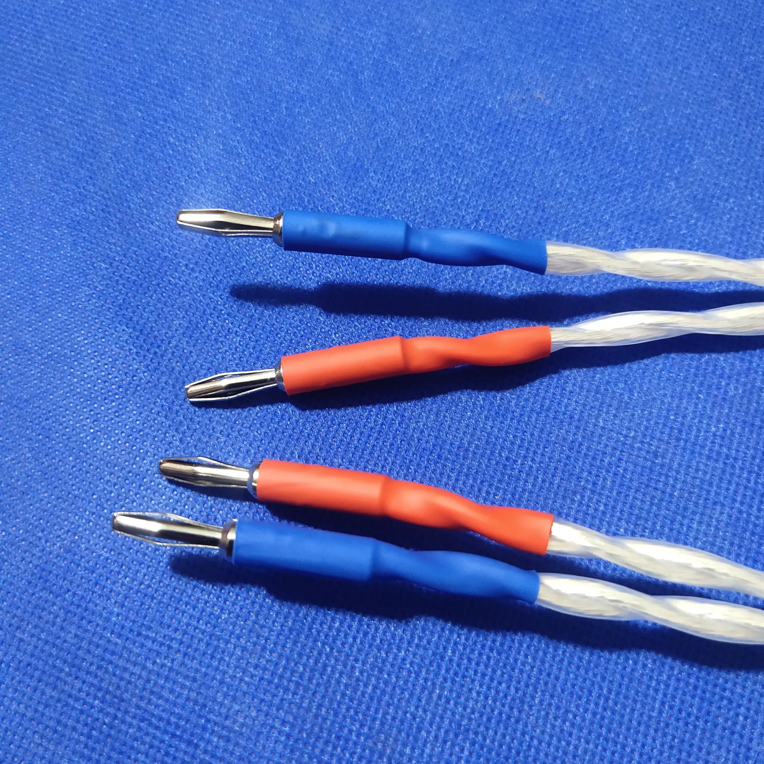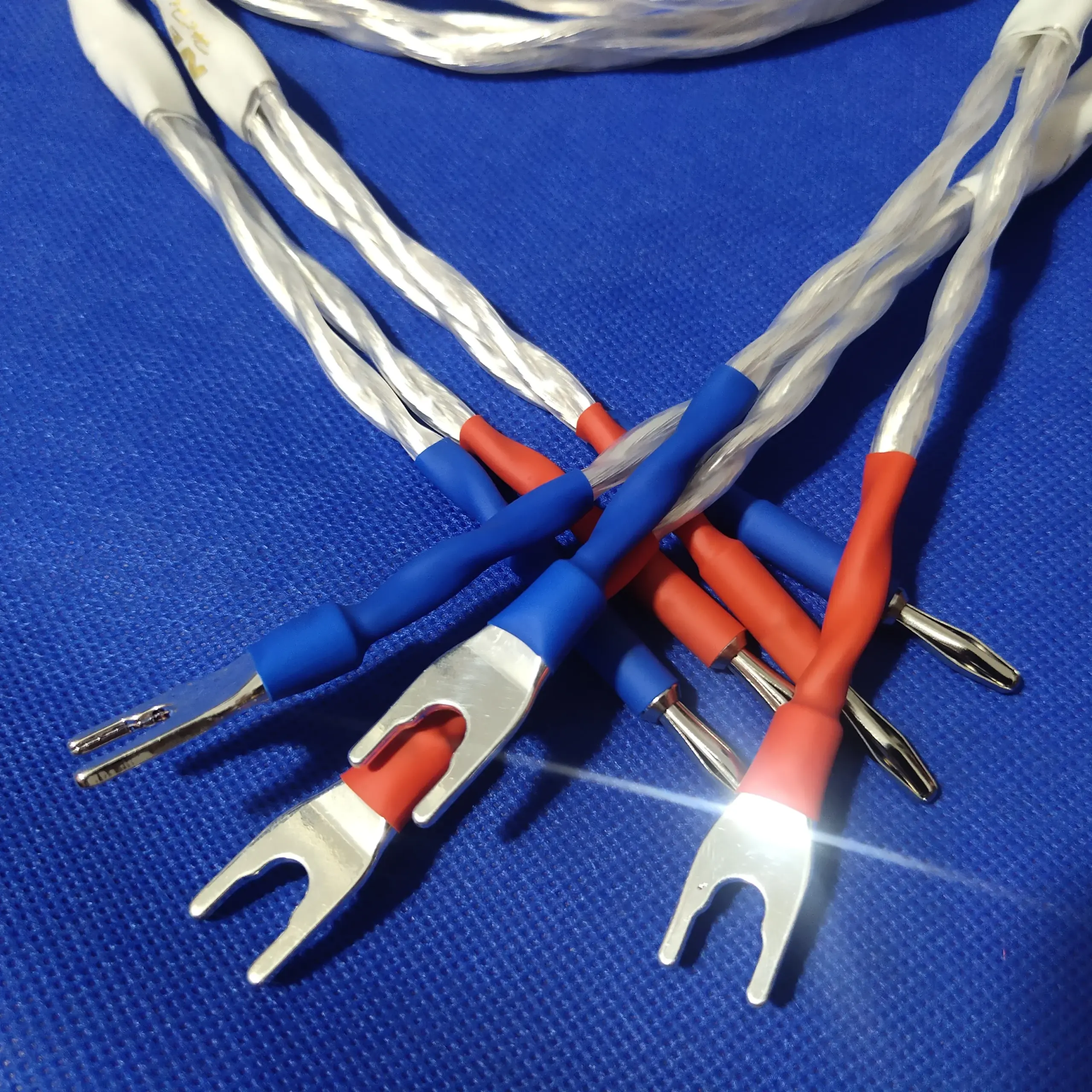 Experience unparalleled audio clarity with this premium speaker cable, meticulously designed for discerning listeners. Crafted from four high-conductivity cores of 2.5 mm² oxygen-free copper utilizing UPOFC technology, it achieves a 6N (99.9999%) purity level for superior signal transmission. The transparent insulation beautifully displays twisted copper strands, emphasizing the high-quality craftsmanship. Sterling silver connectors, available in all banana-plug, all Y-plug, or banana-to-Y configurations, provide a sleek, shiny finish that enhances durability and performance. Red and blue heat-shrink tubing offers intuitive channel identification while maintaining a clean, refined aesthetic. Lightweight and flexible, this cable resists bulkiness, ensuring effortless installation and long-term reliability. Ideal for high-performance audio systems, it delivers extended high frequencies, detailed soundstage, full-bodied vocals, and highly accurate imaging, elevating your listening experience to professional standards.