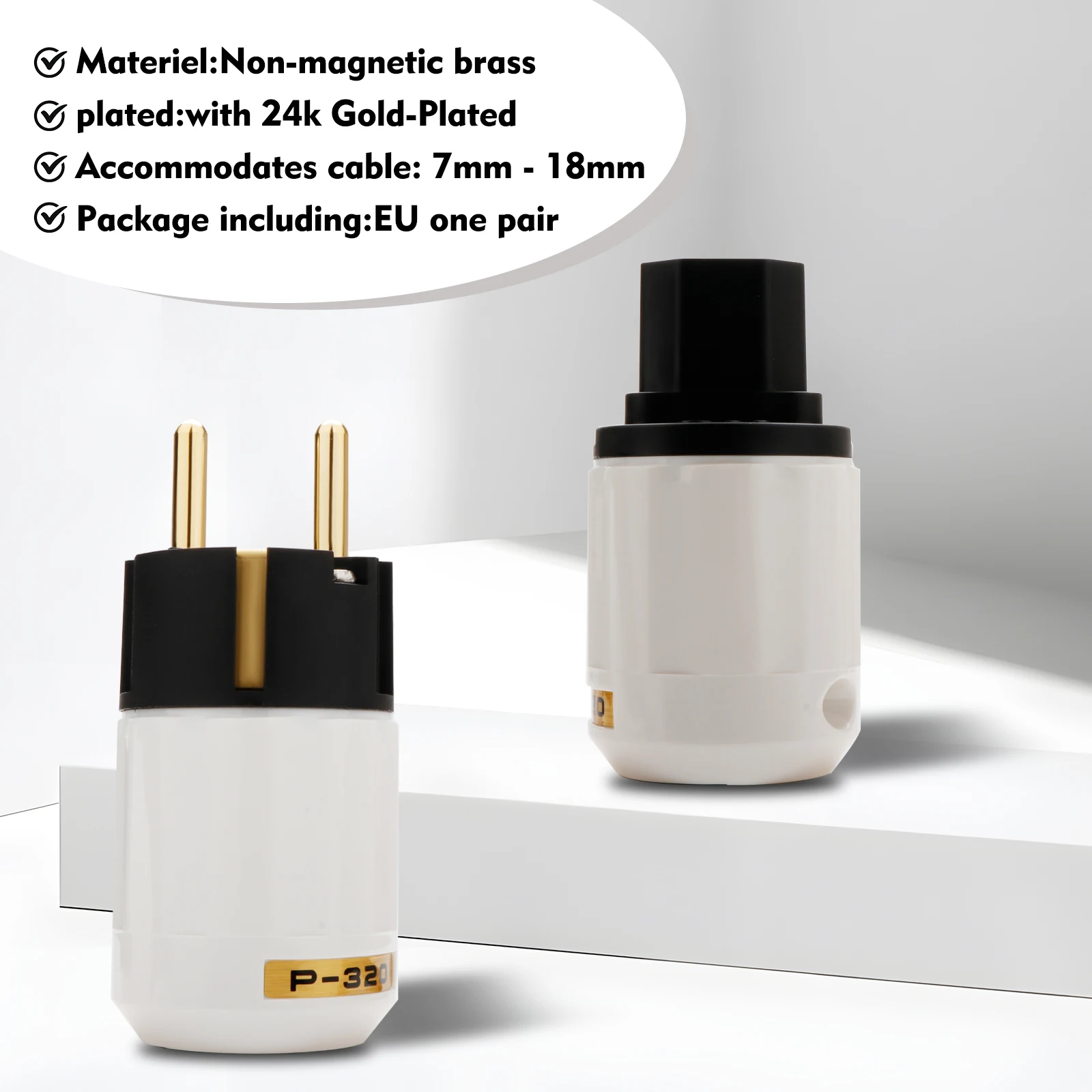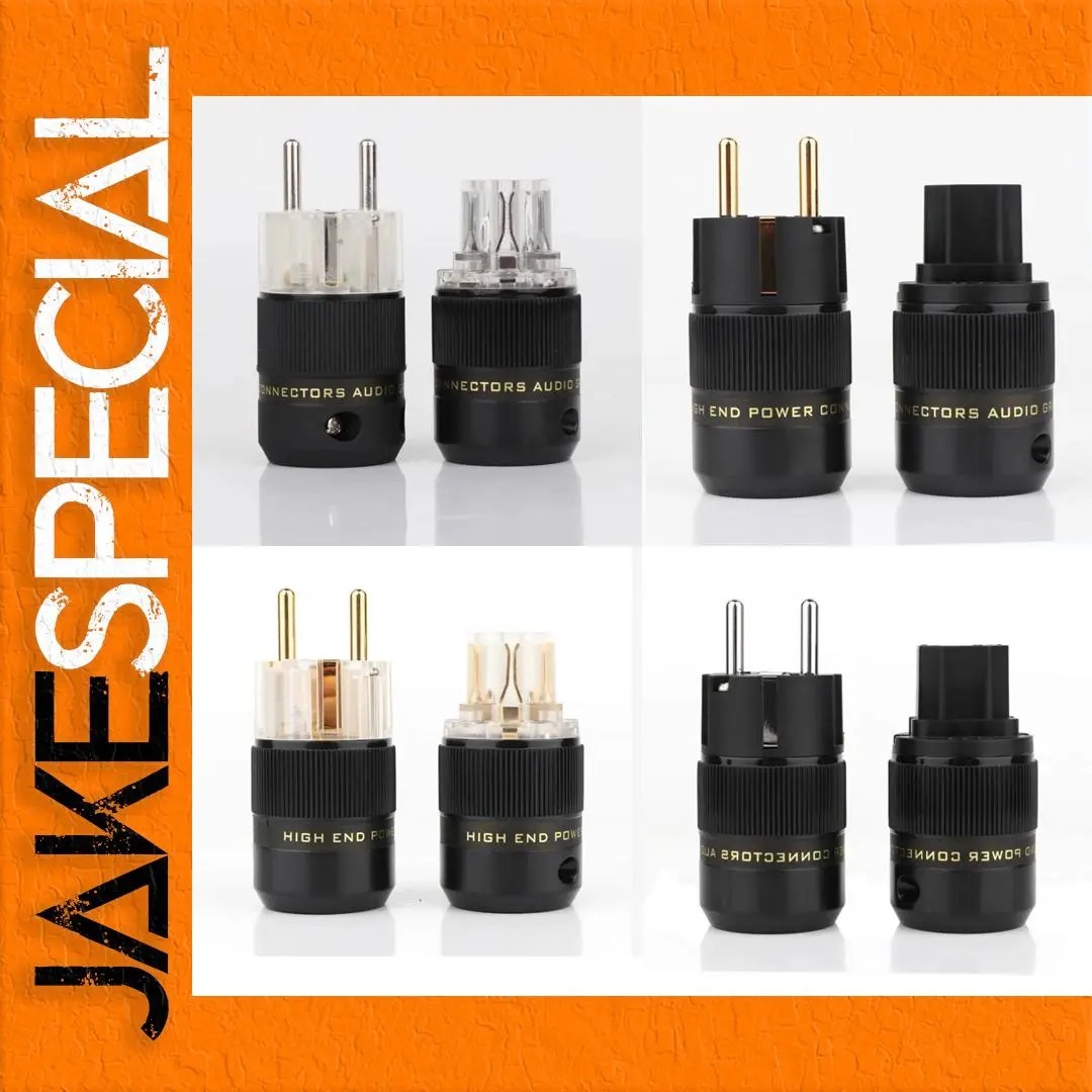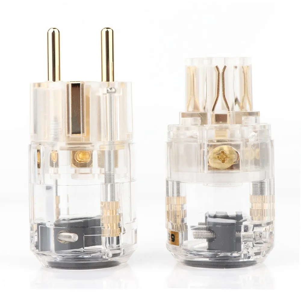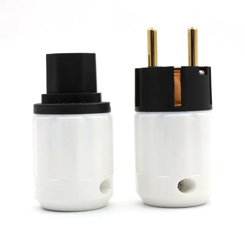This pair of high-quality European power connectors features 24K gold-plated brass construction, designed for cables with diameters between 10mm and 18mm. Each connector measures approximately 50mm in body length, 35mm in diameter, and has an overall length of 69mm. Supportive of voltages up to 250V at 10A and 125V at 15A, they include male and female plugs ideal for DIY power cable assembly, offering enhanced conductivity, durability, and reliable performance. CE and RoHS certified, these connectors combine functional precision with an elegant aesthetic, perfect for those seeking high-end electrical connections in custom audiophile, home theater, or professional applications.