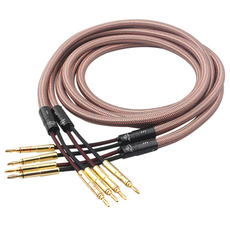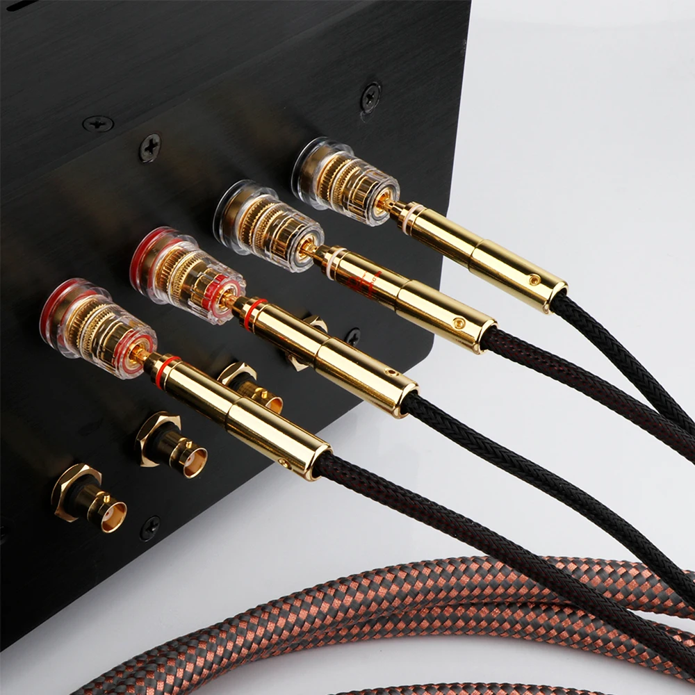 Step into a world of premium sound with this high-end speaker cable designed for discerning audiophiles. Crafted from ultra-high purity 6N OCC copper conductors, it guarantees exceptional clarity and transparency across all frequencies. The sheathed in a sophisticated woven pattern of dark reddish-brown and black, the cable combines durability with a sleek, professional look. Gold-plated banana plugs at both ends ensure stable, corrosion-resistant connections, adding a touch of luxury. With a sturdy 10 mm diameter, this cable is flexible yet robust, perfect for high-fidelity systems. Whether upgrading your home audio or professional setup, this cable offers a seamless combination of aesthetics, durability, and superior sound performance, enhancing every note you hear.
