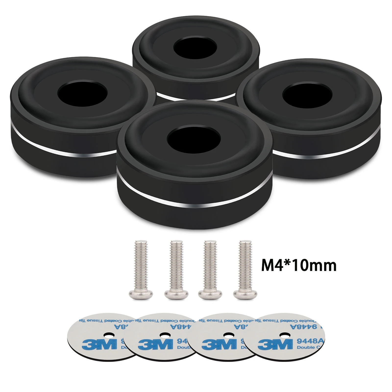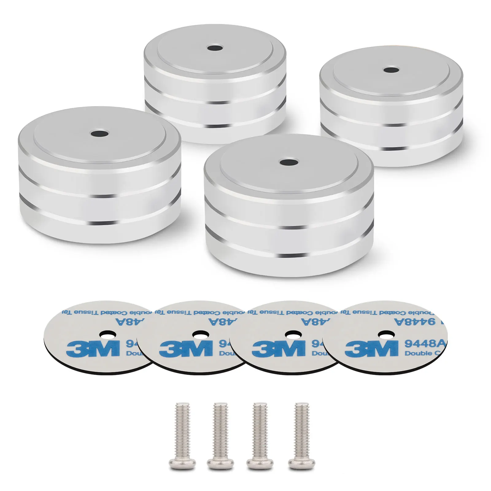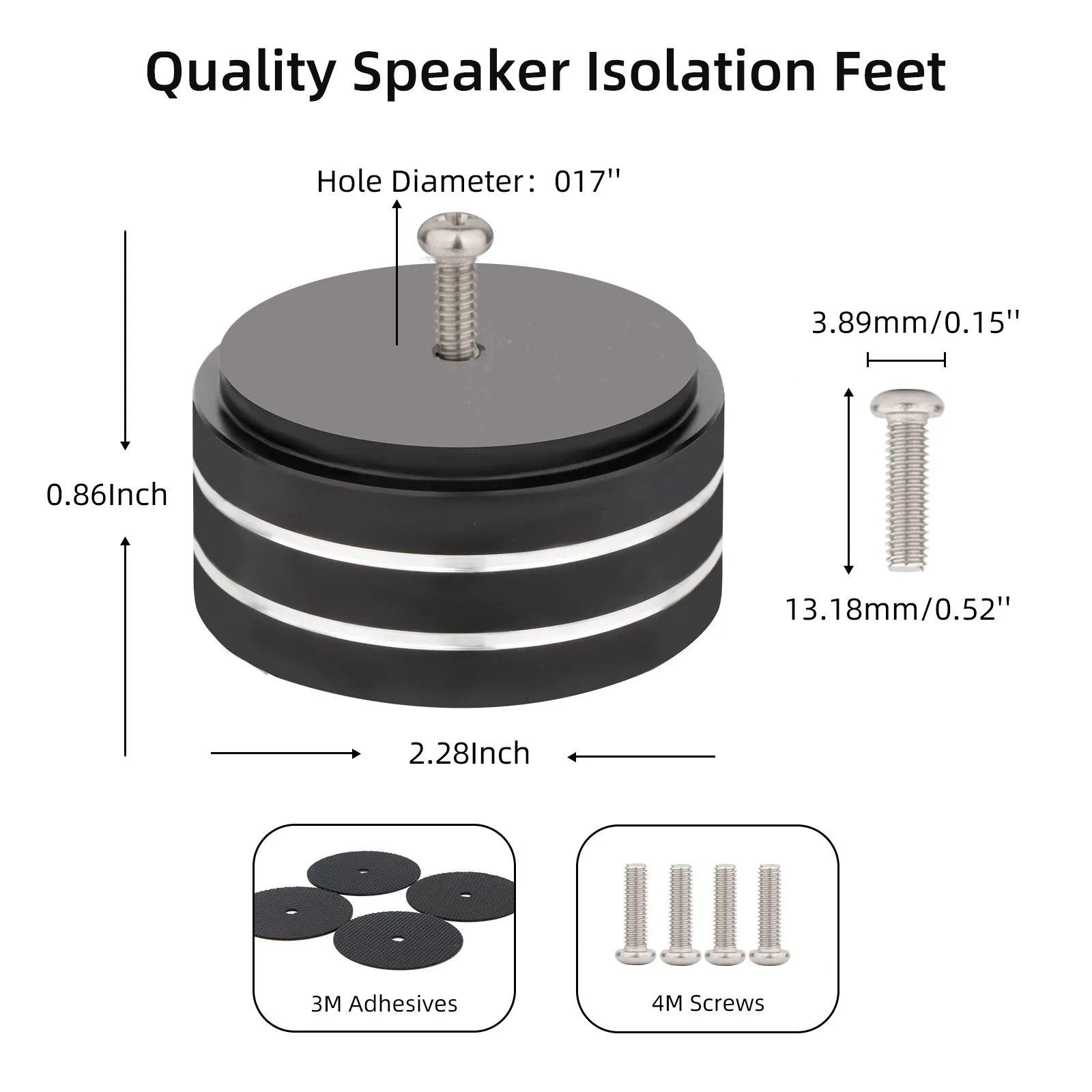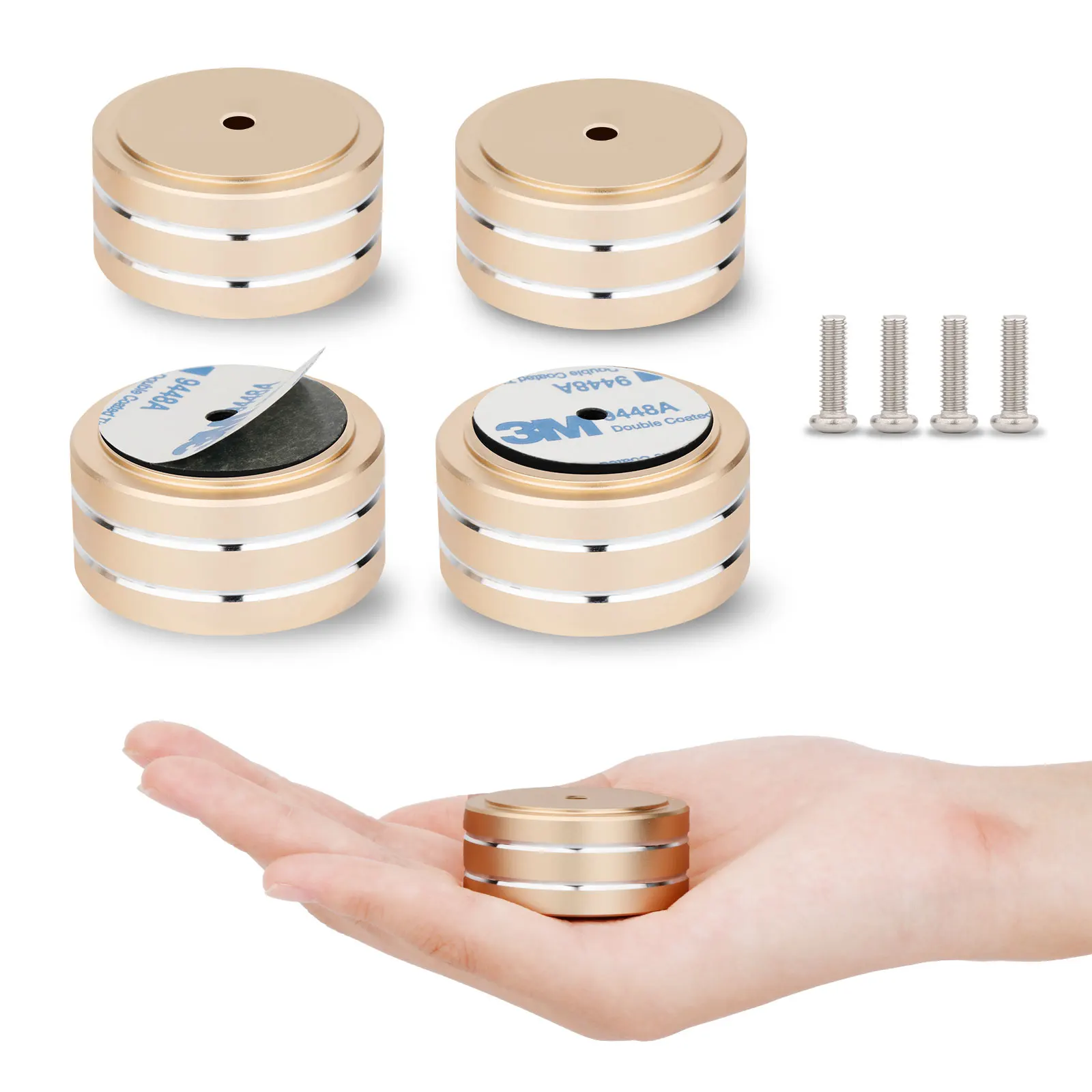 Enhance your high-fidelity audio setup with this sleek set of four speaker insulation spike stands. Crafted from high-hardness 7075 aluminum alloy, these stands provide excellent vibration isolation and stability for your speakers, DACs, amplifiers, or turntables. The design features a smooth, dark finish in black, gold, or silver, emphasizing a modern, minimalist aesthetic. Each stand measures approximately 40 mm in diameter and 20 mm in height, with an easy-to-install 4.5 mm opening that doesn’t require punching holes or double-sided tape. Embedded rubber shock rings further improve sound clarity, stereo imaging, and bass response by dampening vibrations, ensuring a richer listening experience and cleaner sound reproduction. These versatile and elegant stands are perfect for audiophiles seeking to optimize their equipment’s performance and appearance.