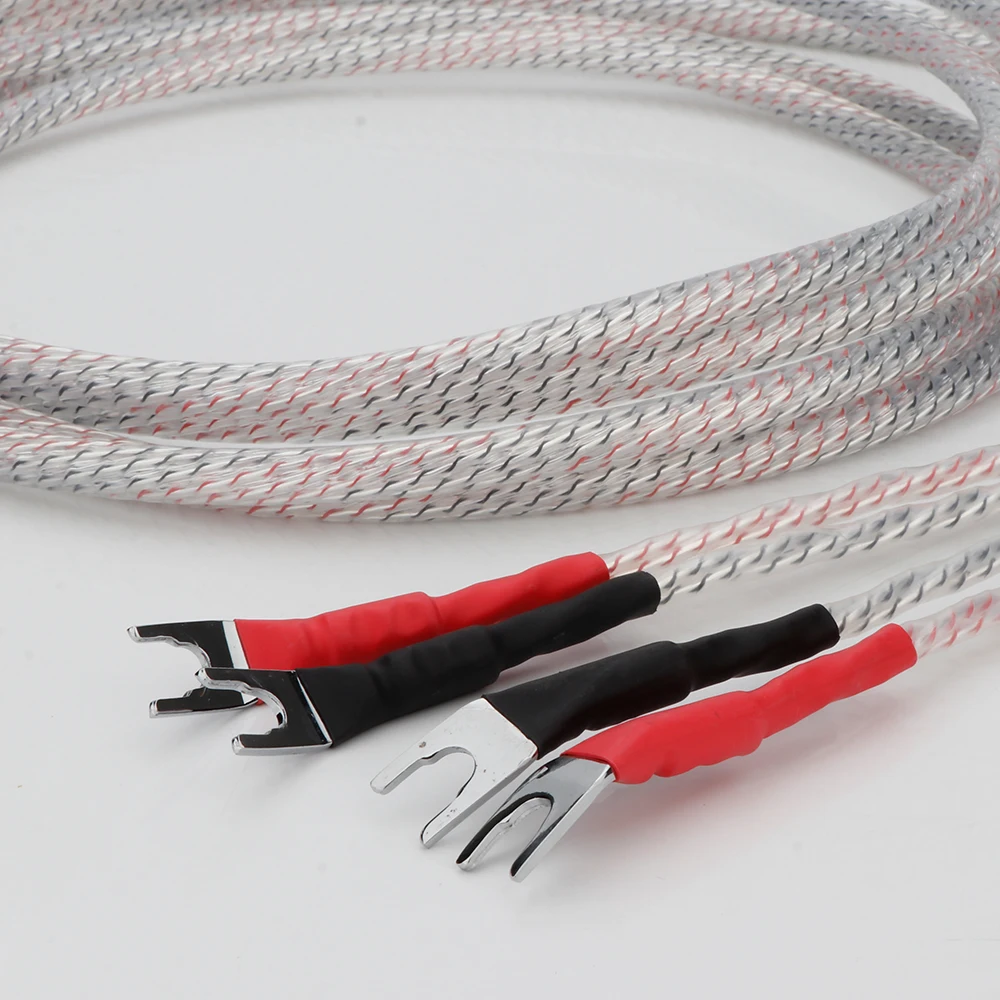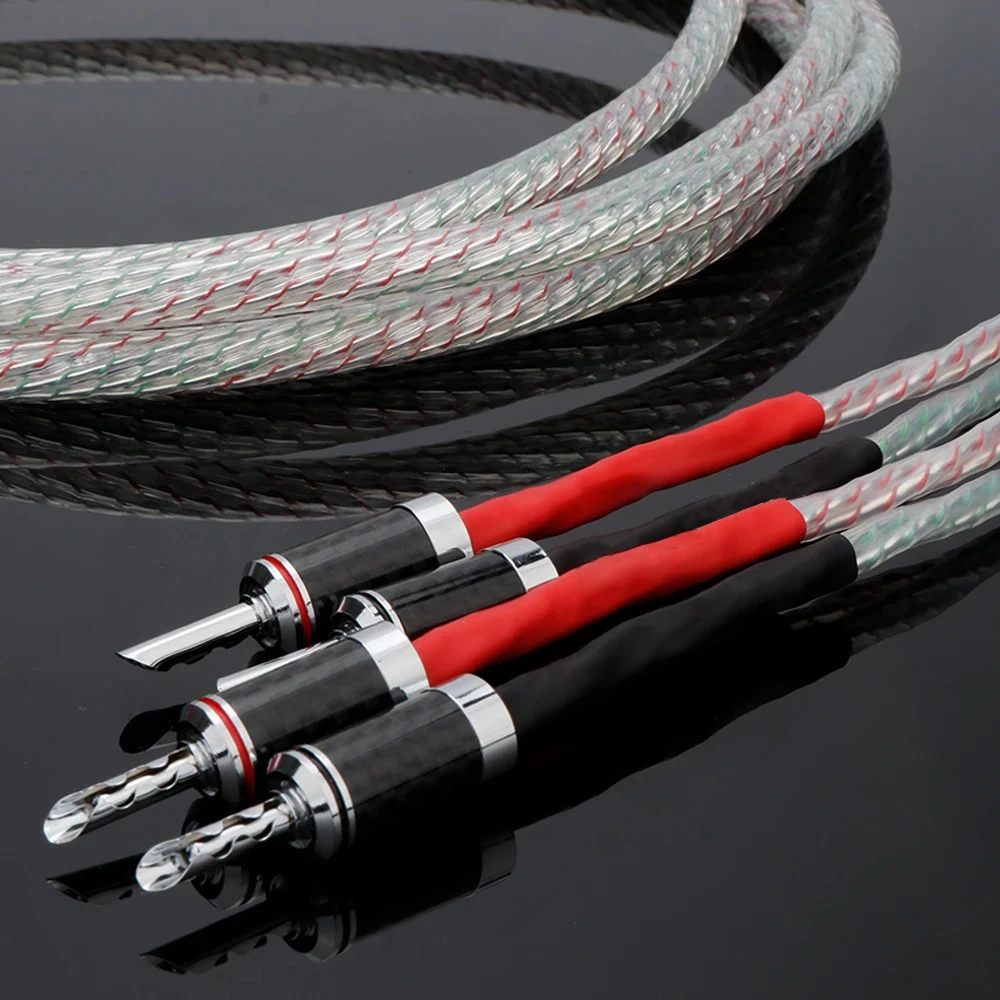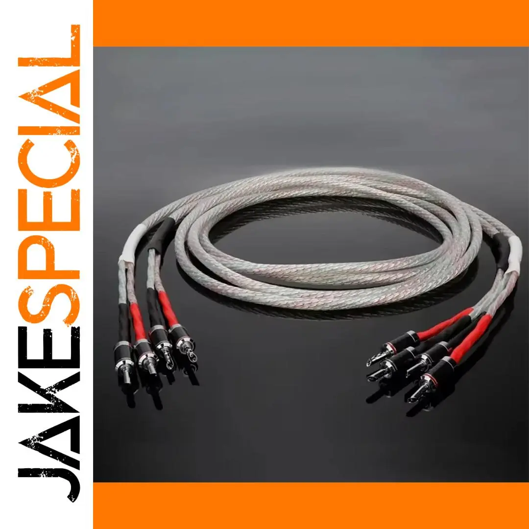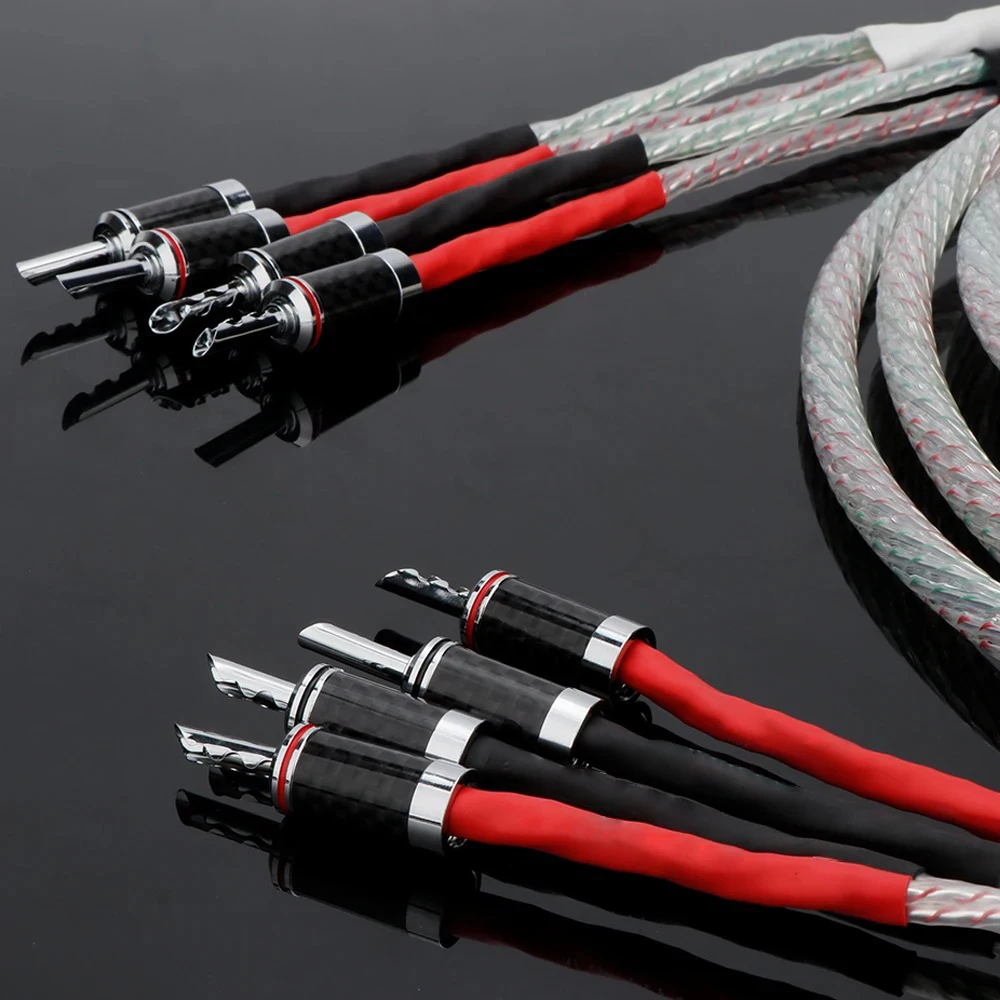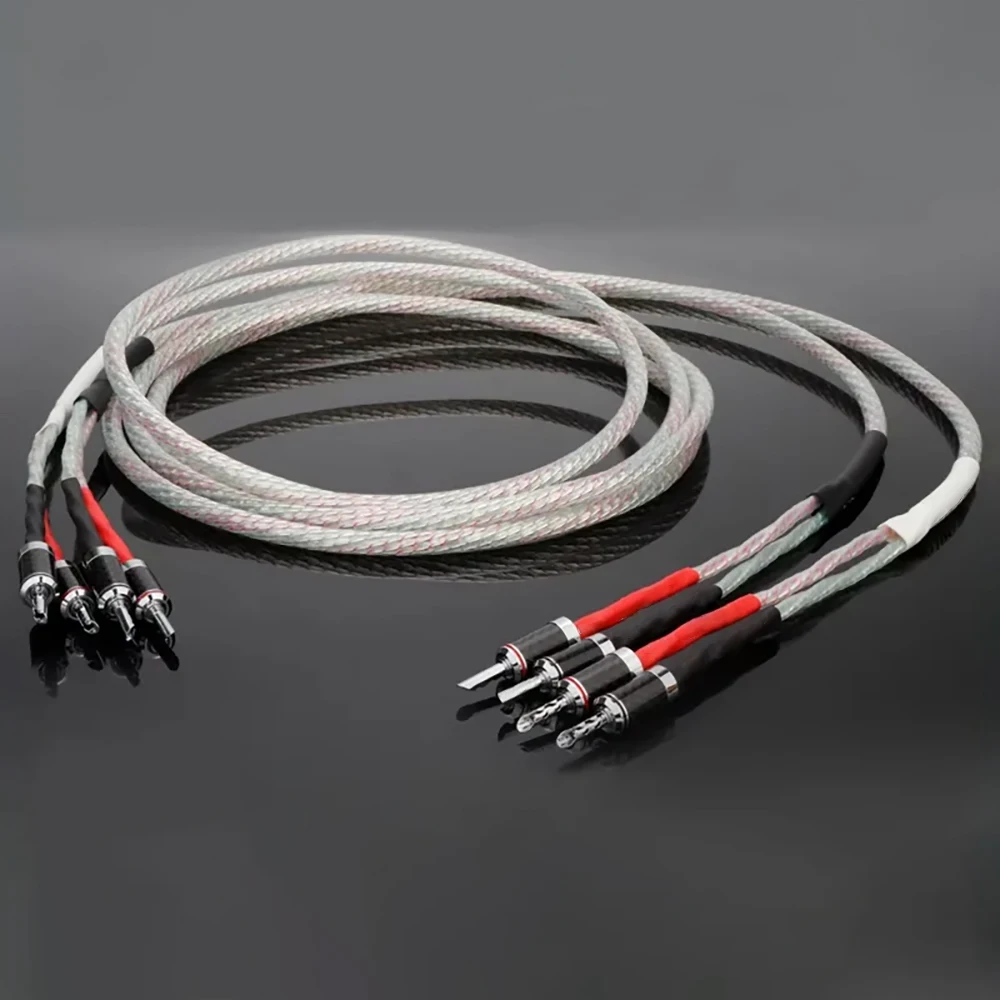 Experience premium sound quality with this flagship speaker cable, meticulously crafted for audiophiles who demand excellence. Featuring 7N OCC silver-plated conductors, it minimizes signal loss for pure, crisp audio reproduction. Its transparent braided silver and white outer insulation showcases the internal wiring, highlighting the high-end craftsmanship. The sturdy black jackets with gold-plated banana plugs ensure secure, corrosion-resistant connections. Available in multiple configurations and lengths, it adapts seamlessly to your audio setup, providing durability, flexibility, and a professional appearance. Whether connecting speakers to amplifiers or subwoofers, this cable guarantees high-performance transmission with a sleek, modern aesthetic that complements any hi-fi system.