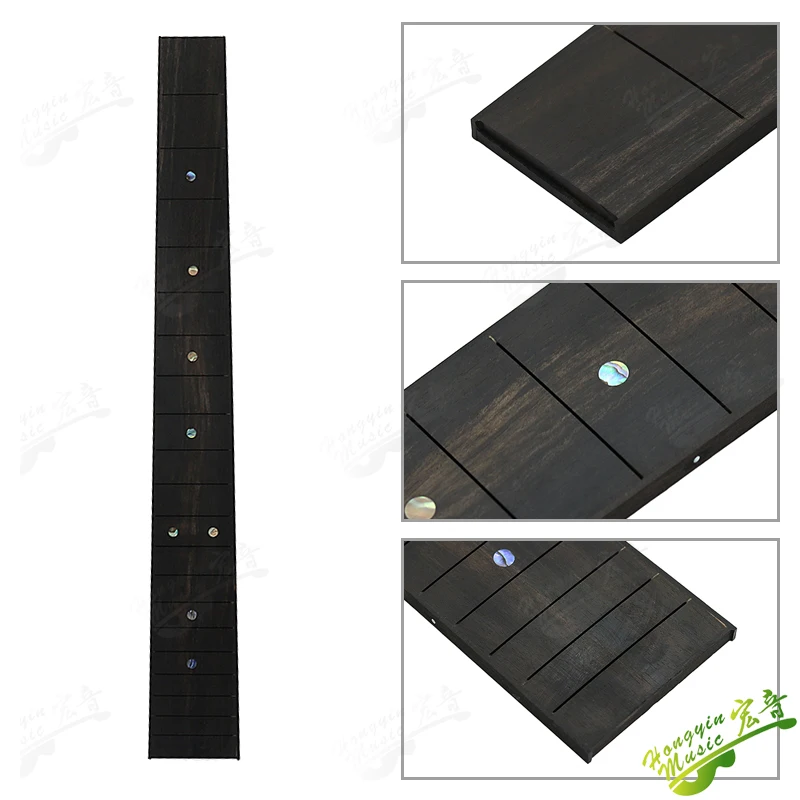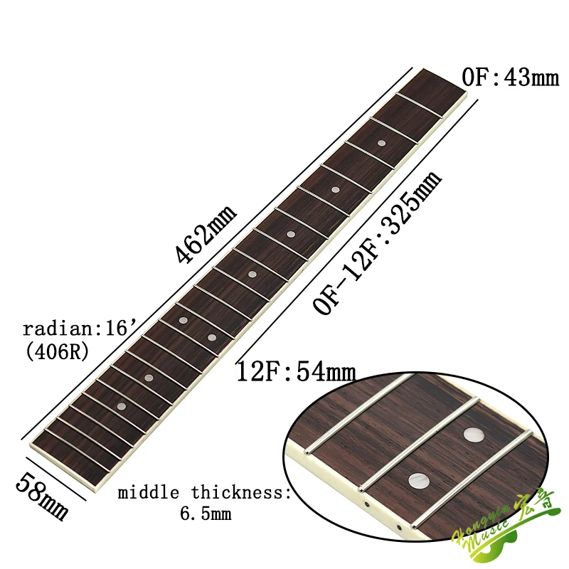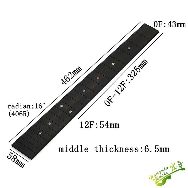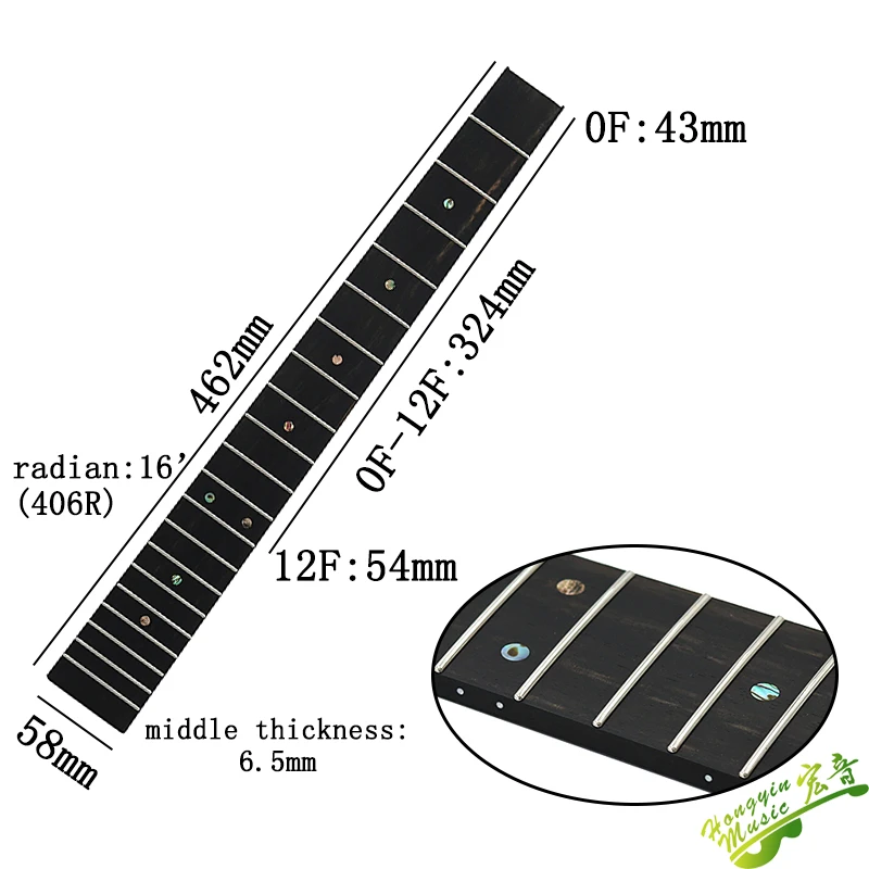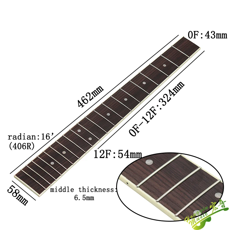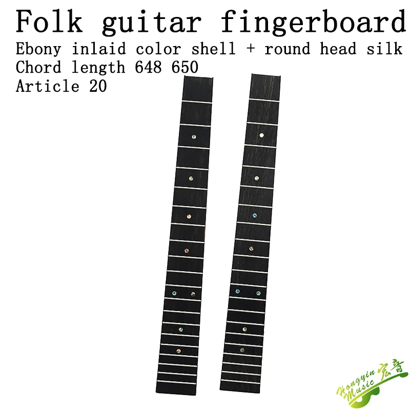 This high-quality guitar fingerboard is designed for acoustic guitars, available in 648mm and 650mm lengths with a 16-inch radius (406mm) and 20 frets. Crafted from durable ebony with abalone shell inlays or rosewood with acrylic accents, it features 2.0mm nickel silver frets, with fret markers at key positions for easy navigation. The fingerboard measures approximately 460mm in length, with a fret spacing of 43mm from nut to 12th fret and 54mm from 12th to 20th fret, and a thickness of 6.5mm. Perfect for customization, this sleek, polished component enhances your guitar’s aesthetics and playability.