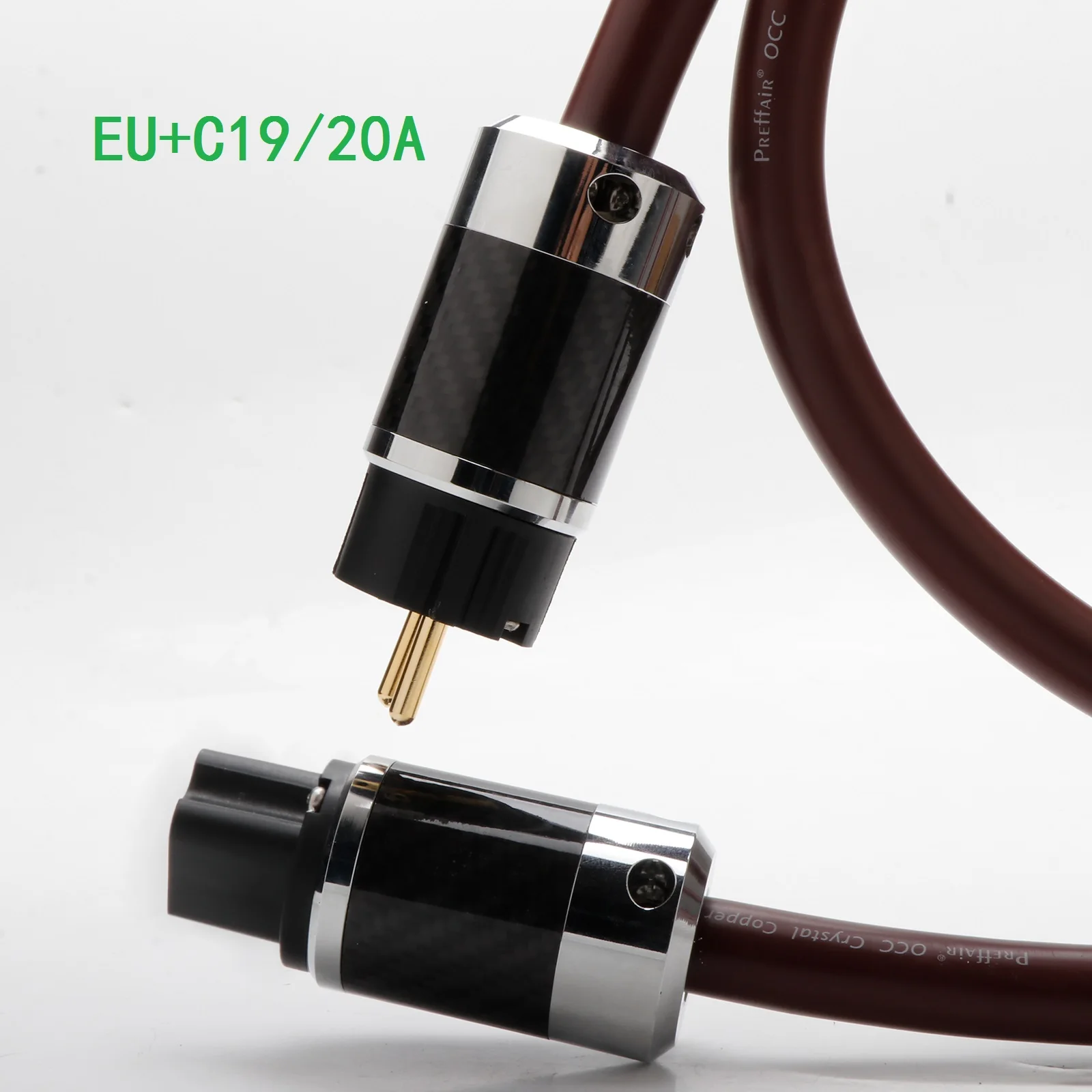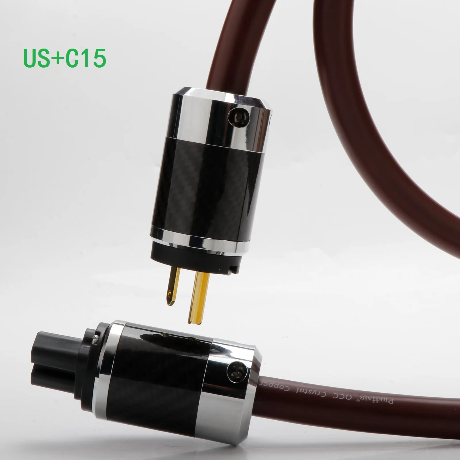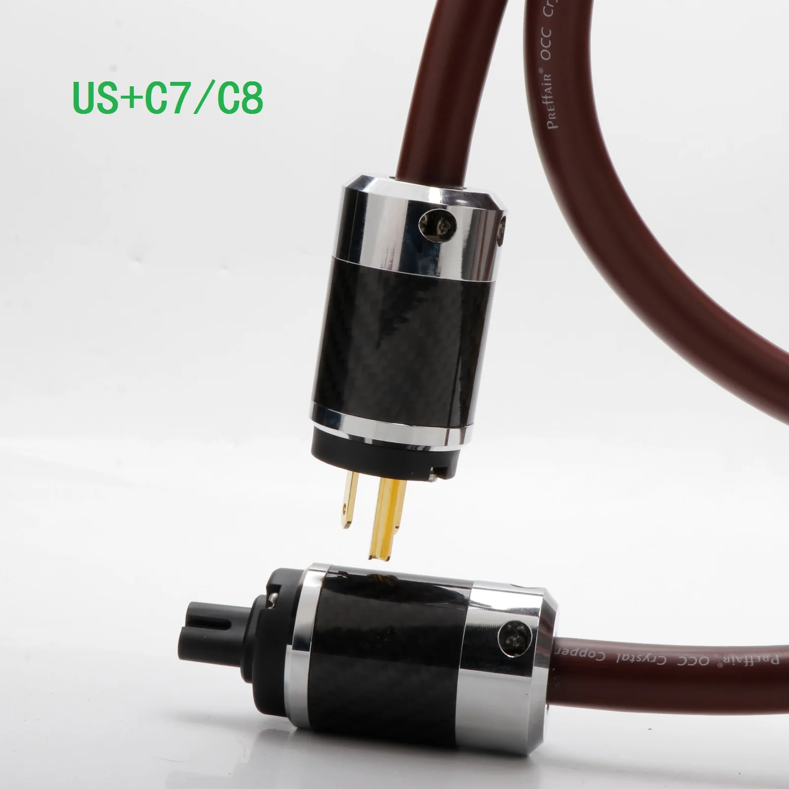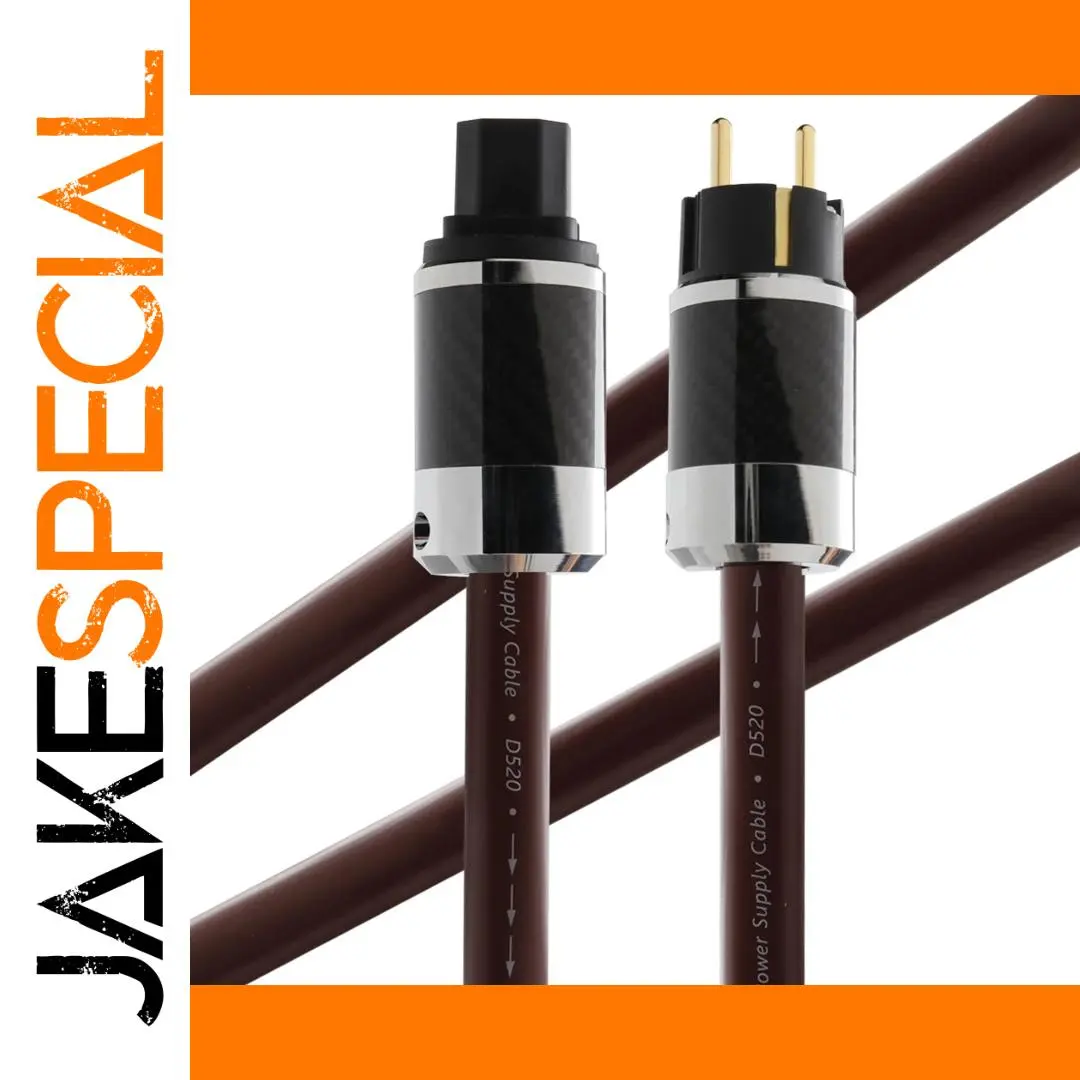 Experience exceptional audio quality with this high-end power cable, meticulously crafted for audiophiles who demand superior performance. Its sleek, brown surface with a subtle glossy finish adds a touch of sophistication to your setup. The shielded design ensures minimal noise interference, delivering pure, crystal-clear sound. Available in multiple lengths from 0.5m to 3m, it provides flexibility for any space. The connectors feature a modern cylindrical shape in black with carbon fiber patterns, accented by shiny metallic silver bands. The male plug with gold-plated prongs guarantees durability and excellent conductivity. Whether connecting an amplifier, speaker, or multimedia device, this cable offers reliable power transmission with high craftsmanship and premium materials to elevate your listening experience.