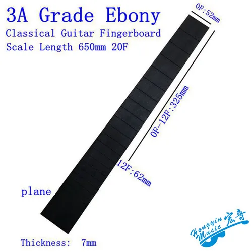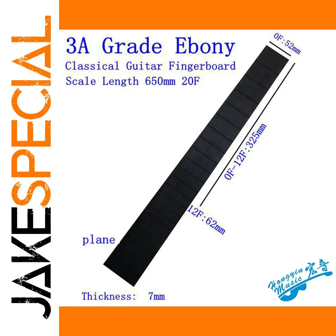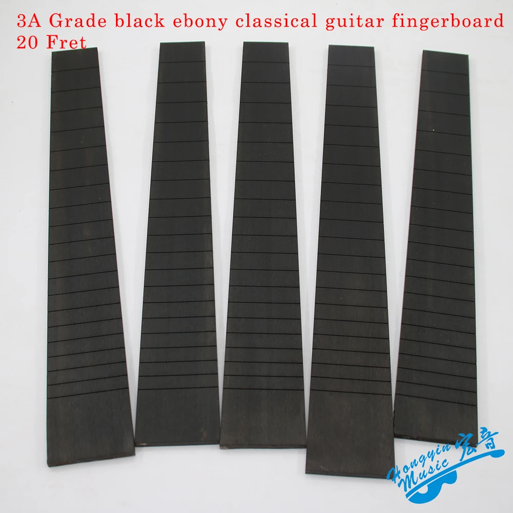 Imagine enhancing your classical guitar with this high-quality, all-black ebony fretboard. Crafted from premium 3A grade African ebony, it showcases a sleek, polished finish that emphasizes its refined dark hue. Measuring 500mm in length with a 650mm chord length, this semi-finished fingerboard provides a perfect fit for standard classical guitars. Its smooth surface, approximately 7mm thick, features 20 evenly spaced fret slots designed for precise inlay fret wires. The slightly satin matte finish offers a sophisticated look while ensuring comfortable playability. Ideal for experienced luthiers or passionate guitar enthusiasts, this fretboard ensures durability, quality craftsmanship, and timeless style. Elevate your instrument's aesthetic and sound with this premium component.