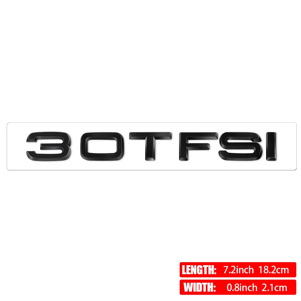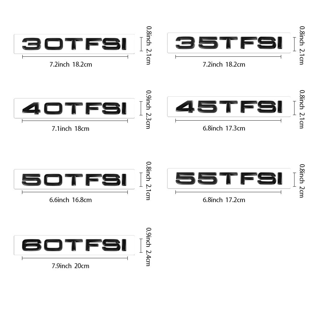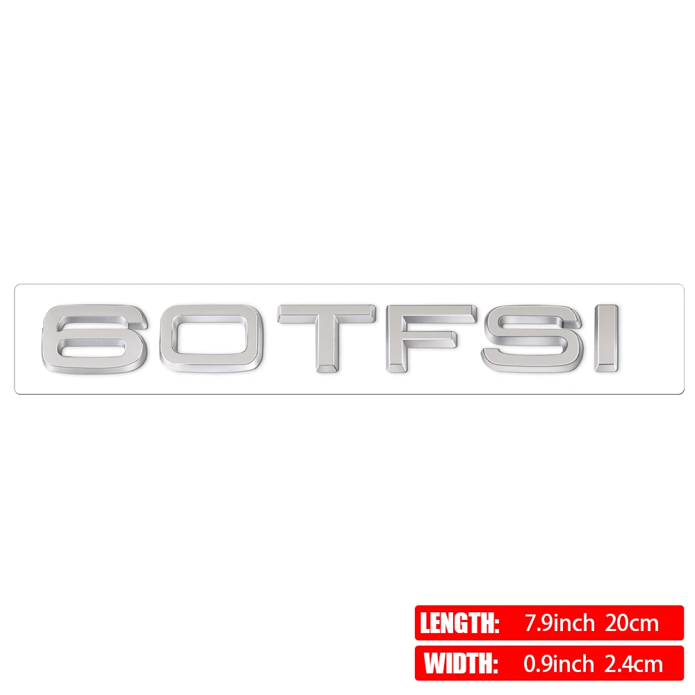 Transform your vehicle’s appearance with this sleek and modern car badge emblem. Crafted from high-quality, heat-resistant ABS material, it features a glossy finish that exudes a premium look. The emblem showcases bold, uppercase 3D characters with a slightly curved design, giving a sophisticated and eye-catching effect. Available in black or metallic silver, it perfectly matches a range of engine types from 30TFSI to 60TFSI. Easy to install, simply peel and stick securely without damaging your car's surface or leaving residue. Designed to withstand harsh environmental conditions such as sunlight and heat, this emblem ensures long-lasting durability. Elevate your vehicle’s aesthetic and showcase your style effortlessly.