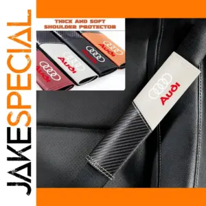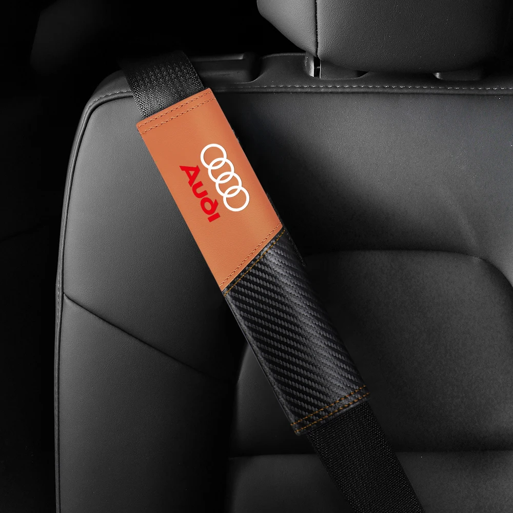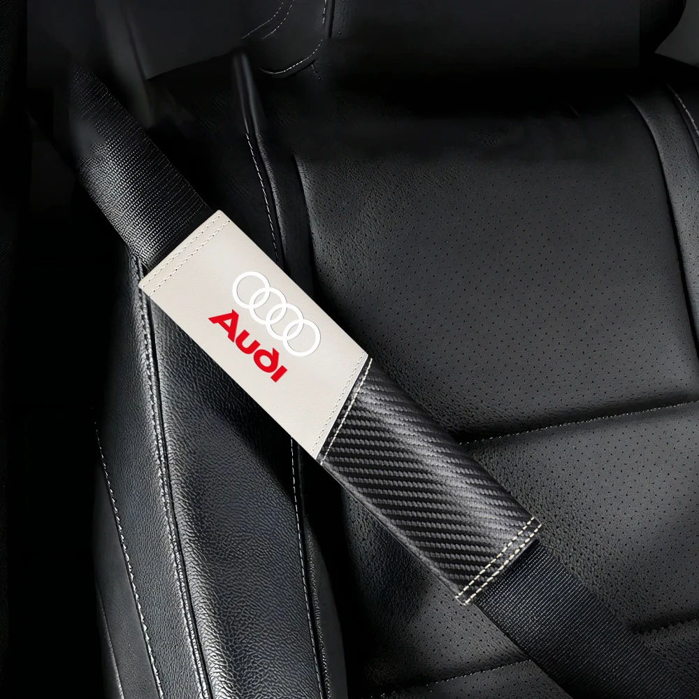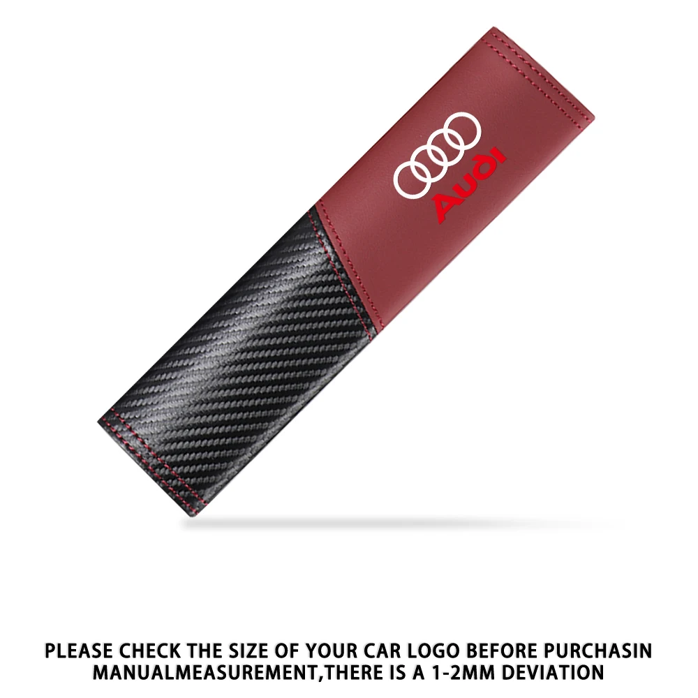 Enhance your driving comfort and style with this high-quality carbon fiber seat belt shoulder protector, featuring a textured diagonal weave for a sporty look. The smooth leather-like top section is embroidered with the iconic four-ring logo and bold red lettering, adding a touch of luxury. Equipped with a fixed Velcro strip for secure attachment, it is adjustable to fit various seatbelt widths and compatible with a wide range of vehicle models, including A, Q, RS, S, R8, and Quattro series. Available in black, beige, orange, and red, this protector combines durability, breathability, and sophisticated design for a premium driving experience.