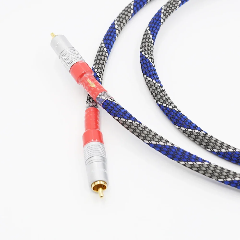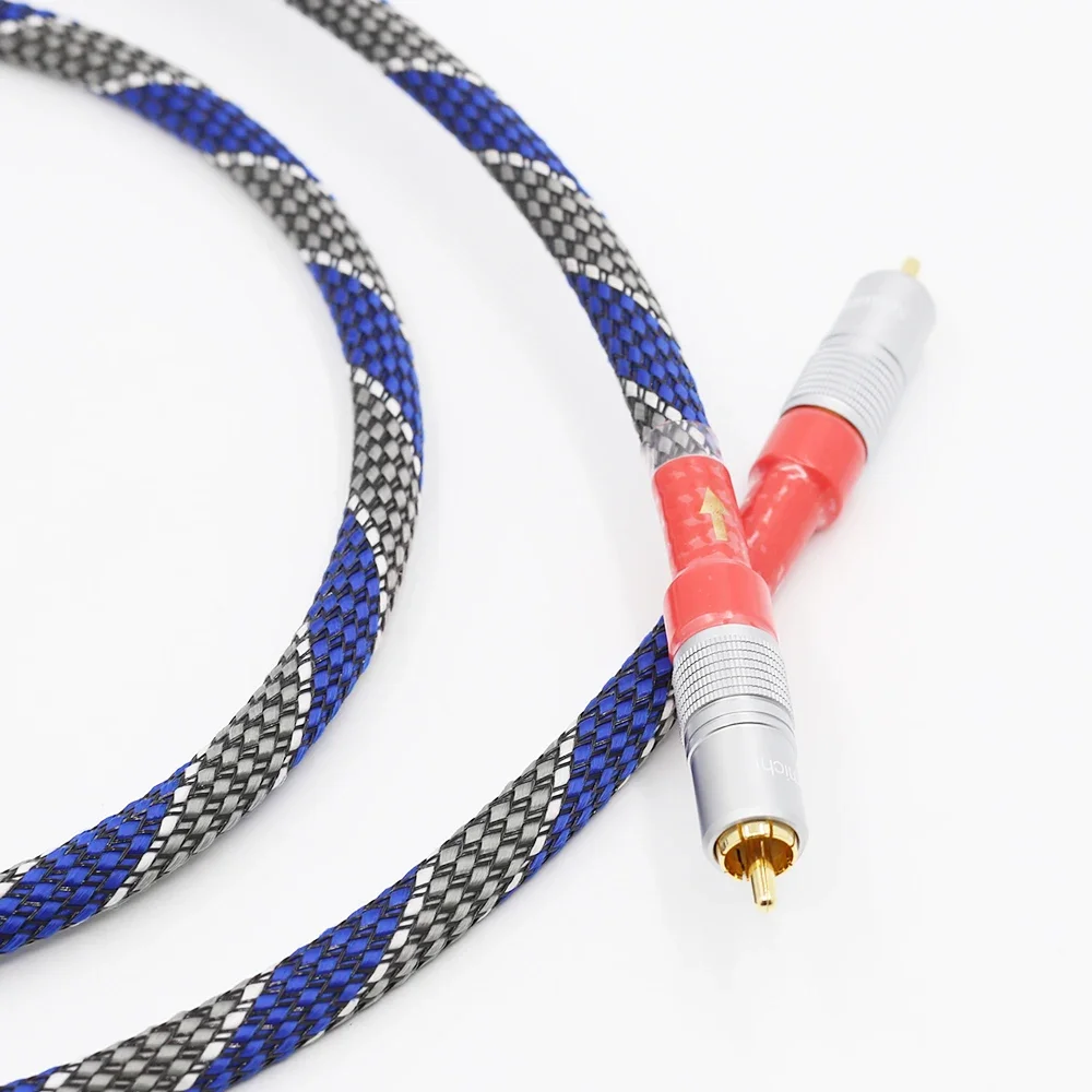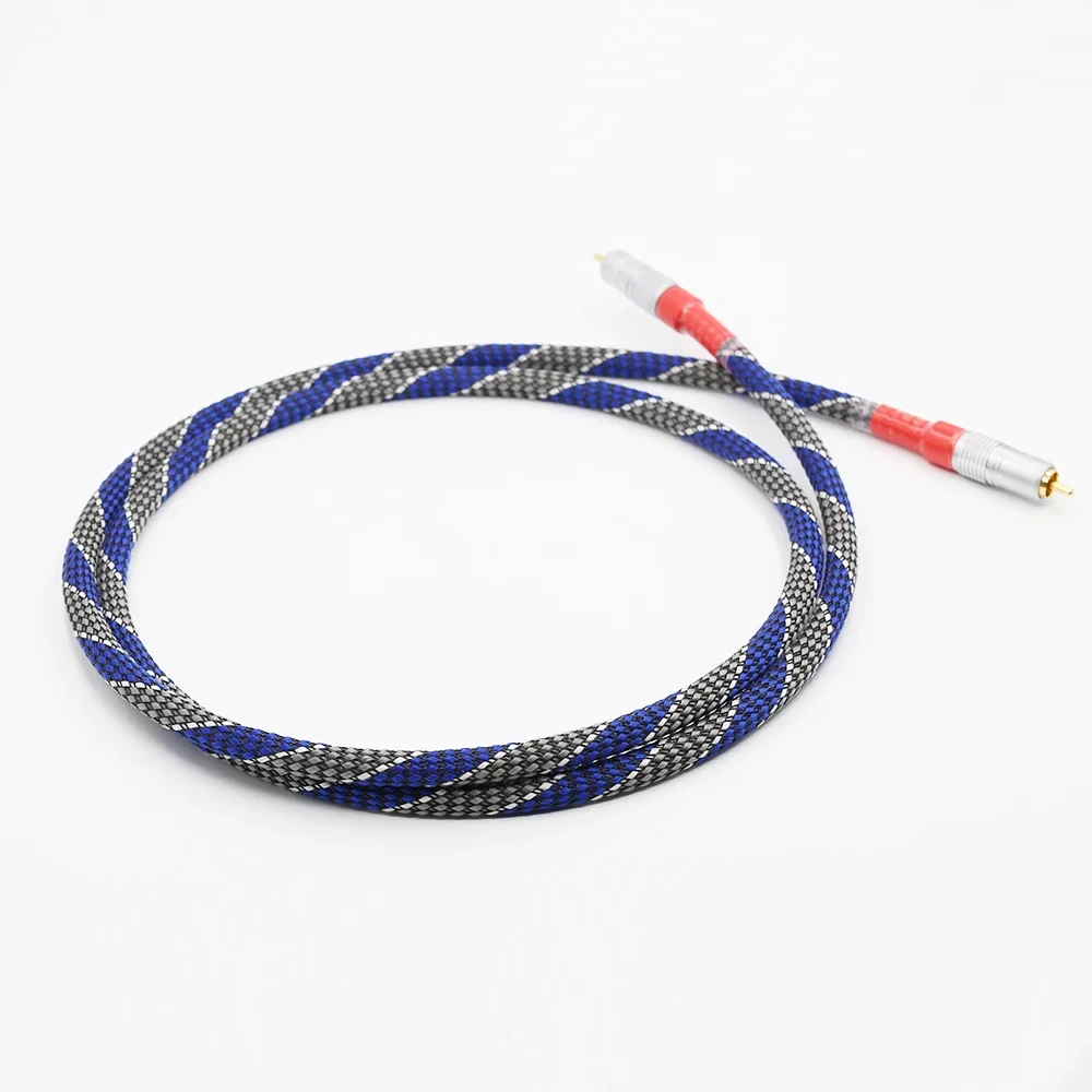 Immerse yourself in superior audio and digital signal quality with this high-end coaxial cable. Designed to deliver crystal-clear sound, it features a braided outer sheath woven with intertwined blue, gray, and black threads, creating a sleek, modern look while ensuring durability. The silver-colored RCA connectors with polished metallic finishes are complemented by red plastic sleeves, offering both aesthetic appeal and easy identification. Equipped with copper-plated plugs and metal shells, the connectors provide robust shielding against external interference. Made with 8N OFC (Oxygen-Free Copper) conductors at 99.999999% purity, this cable ensures maximum signal transfer, minimizing distortion. Its high-density external protection adds resistance against shocks and wear, making it a reliable component for your high-fidelity audio setup.