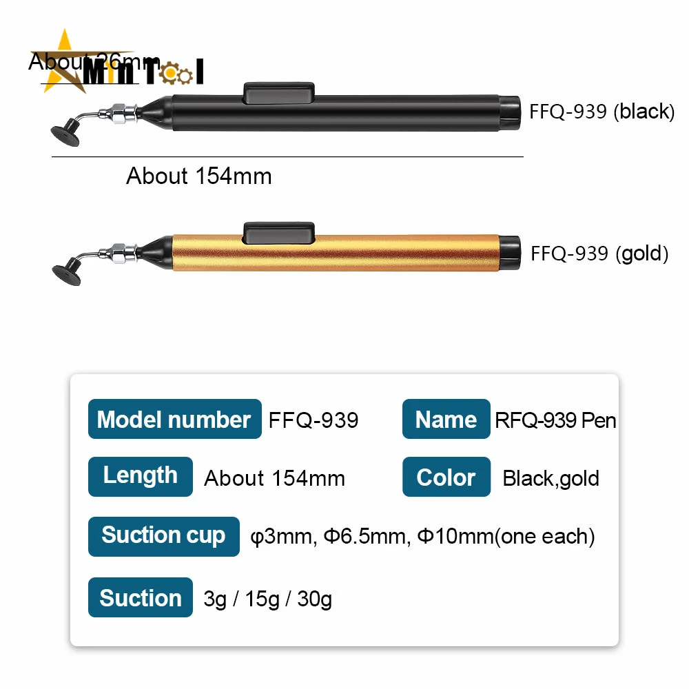 Experience precision and ease with this stylish vacuum suction pen, designed to elevate your electronic assembly and repair tasks. With a length of 154mm and weighing only 50 grams, it offers portability and comfort for extended use. Its minimalist, professional design features a choice between a luxurious metallic gold finish and a modern matte black body, each complemented by a small black switch for vacuum control, and a sophisticated metallic neck connecting to black nozzles. The pen includes three interchangeable suction cups (3mm, 6.5mm, and 10mm) supporting a range of lifting capacities, making component handling safer and more efficient. Its anti-static features ensure safe handling of sensitive components such as ICs, chips, lamps, and resistors, helping you work confidently.