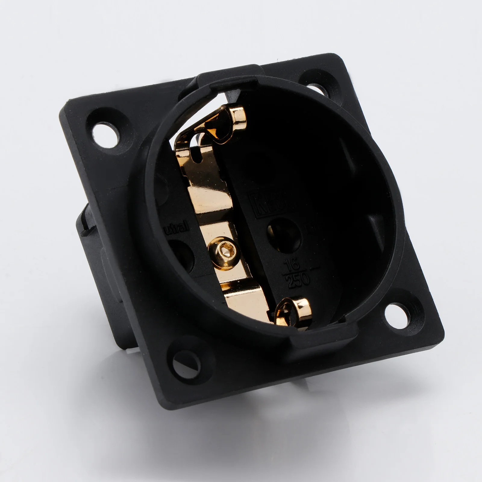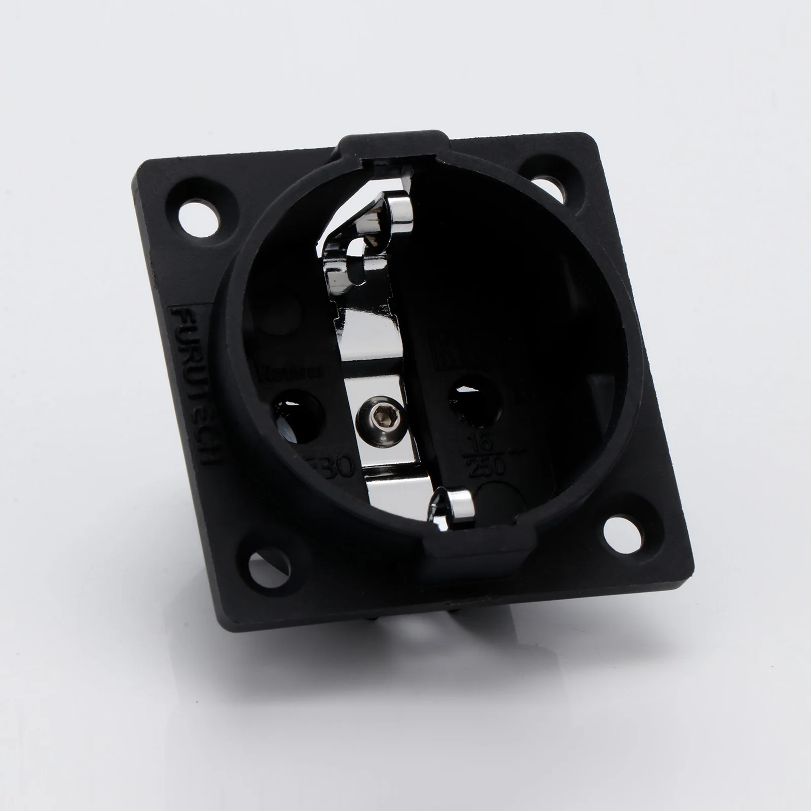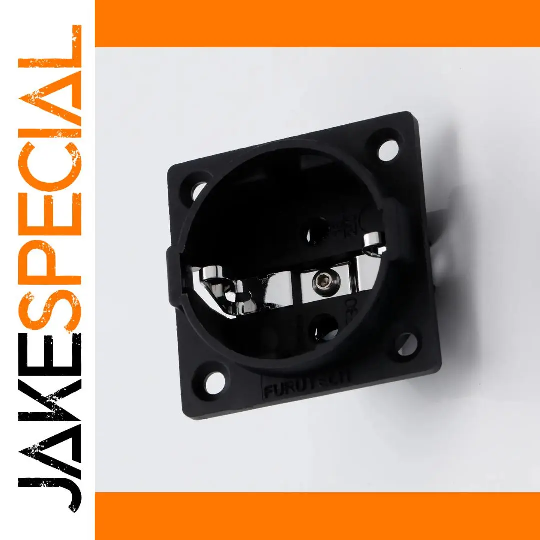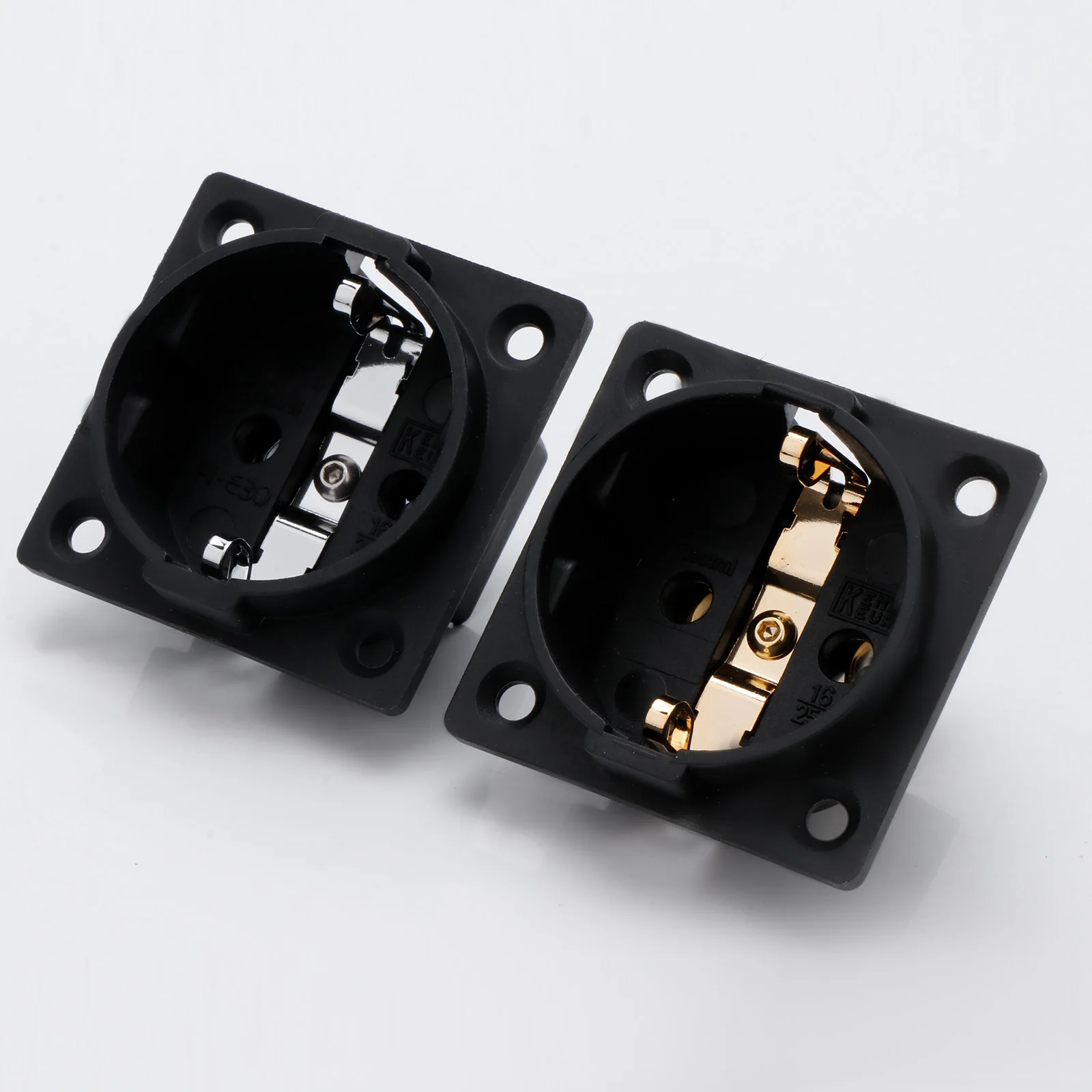 Experience reliable power connections with this high-quality EU Schuko socket, model FI-E30. Crafted from pure copper and finished with rhodium or gold plating, it offers superior conductivity and durability. Rated at 250V and 16A, it supports secure, high-performance electrical connections for chassis mounting applications. The socket features a sleek, black square housing with a circular recessed opening for a European two-pin plug, complemented by precisely engineered metallic contact points. Compatible with EU 2-pin plugs and equipped with a male IEC inlet connector, it is ideal for professional, industrial, or high-end audio setups. Available in single or dual-pack options, with color choices in gold (SM0020G) or rhodium (SM0020R).