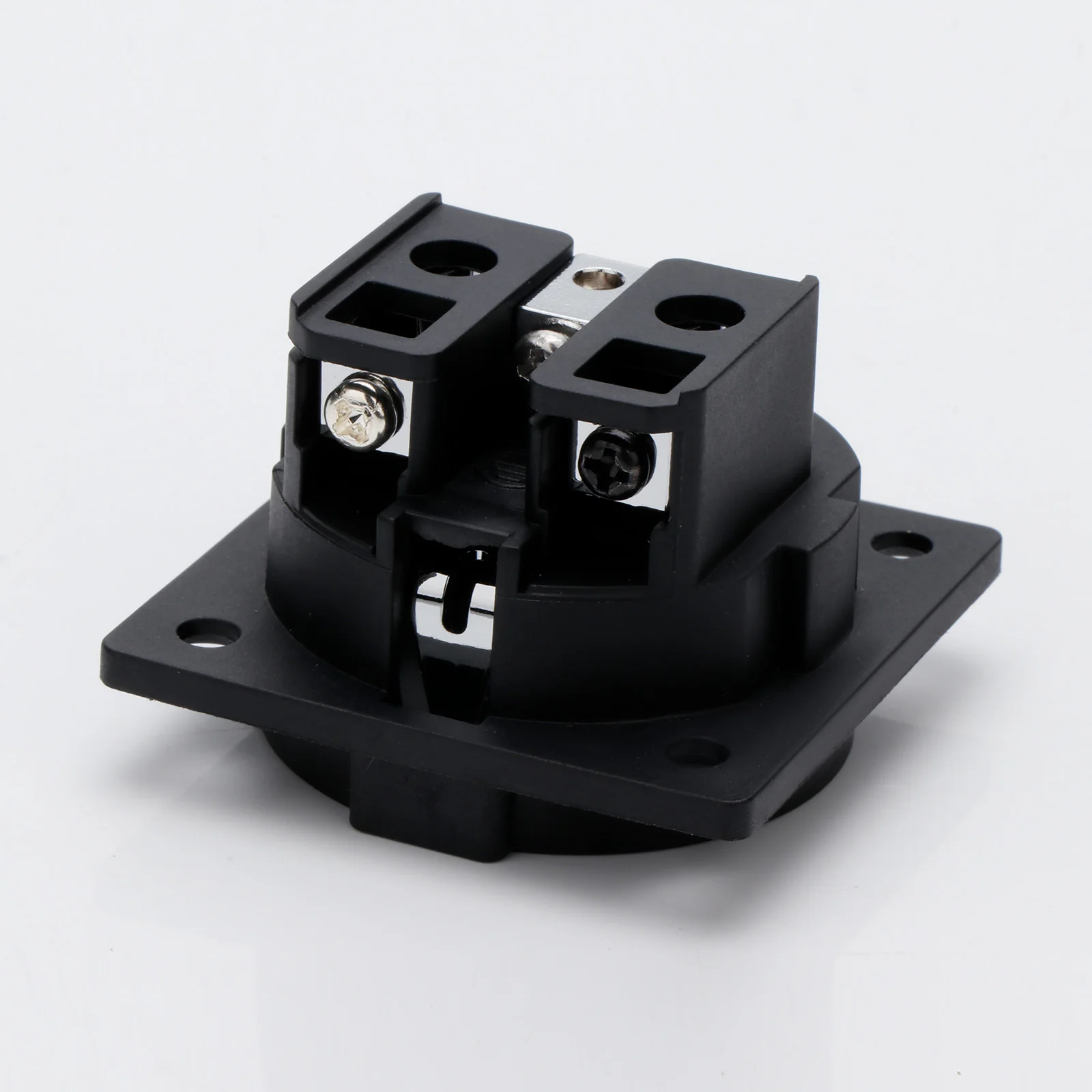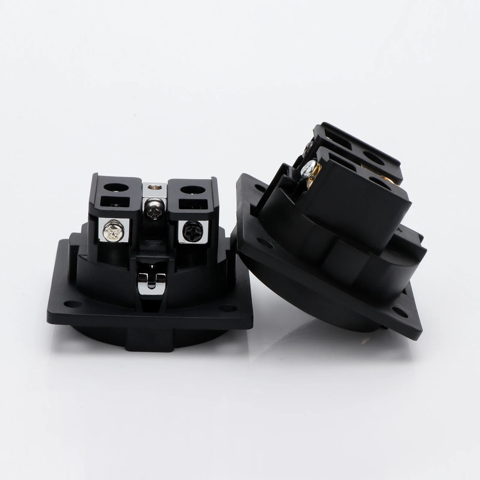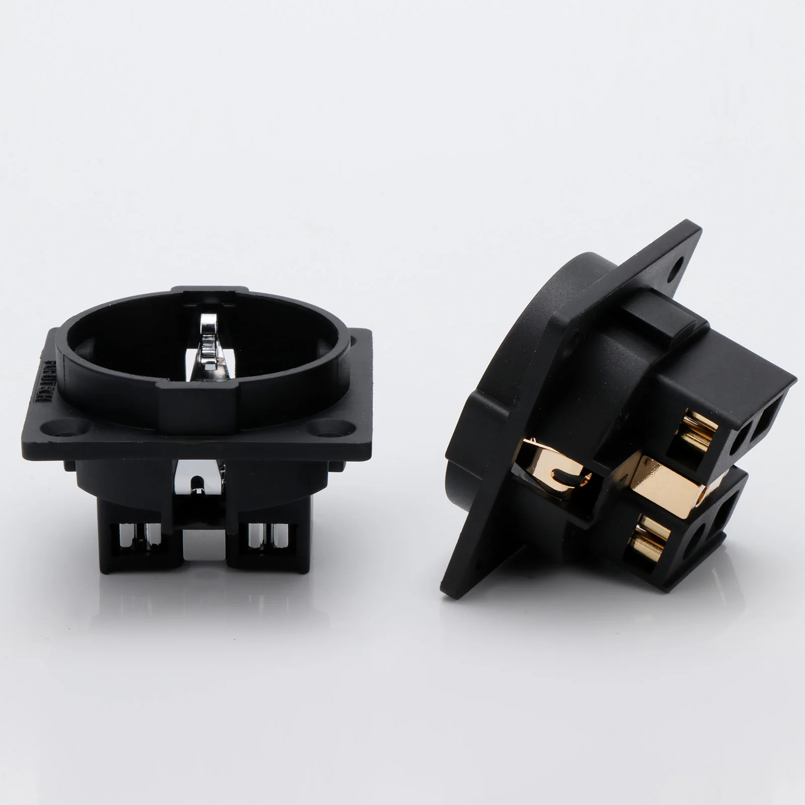 Experience reliable power connections with this high-quality EU Schuko socket, model FI-E30. Crafted from pure copper and finished with rhodium or gold plating, it offers superior conductivity and durability. Rated at 250V and 16A, it supports secure, high-performance electrical connections for chassis mounting applications. The socket features a sleek, black square housing with a circular recessed opening for a European two-pin plug, complemented by precisely engineered metallic contact points. Compatible with EU 2-pin plugs and equipped with a male IEC inlet connector, it is ideal for professional, industrial, or high-end audio setups. Available in single or dual-pack options, with color choices in gold (SM0020G) or rhodium (SM0020R).